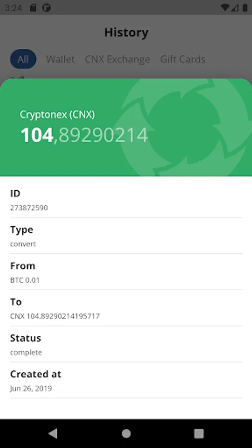 You can top up your wallet balance by scanning the offline exchange card; the funds available on the card (BTC, ETH, CNX and others) will instantly be deposited.