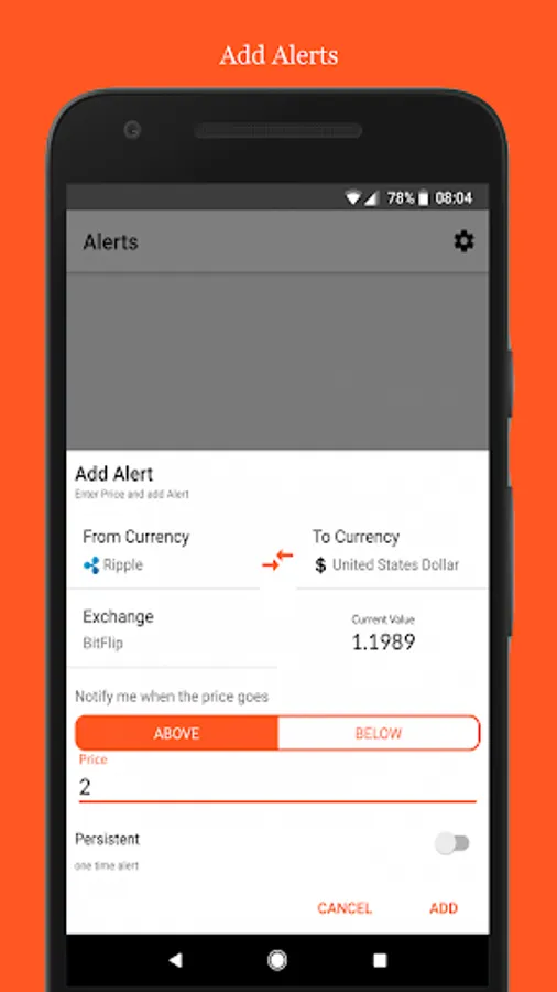 ☛ Alerts - Track price changes by setting alerts when prices go above or below a desired value in any of the supported cryptocurrencies and exchanges