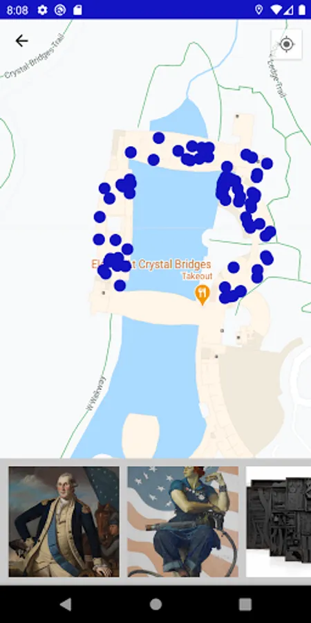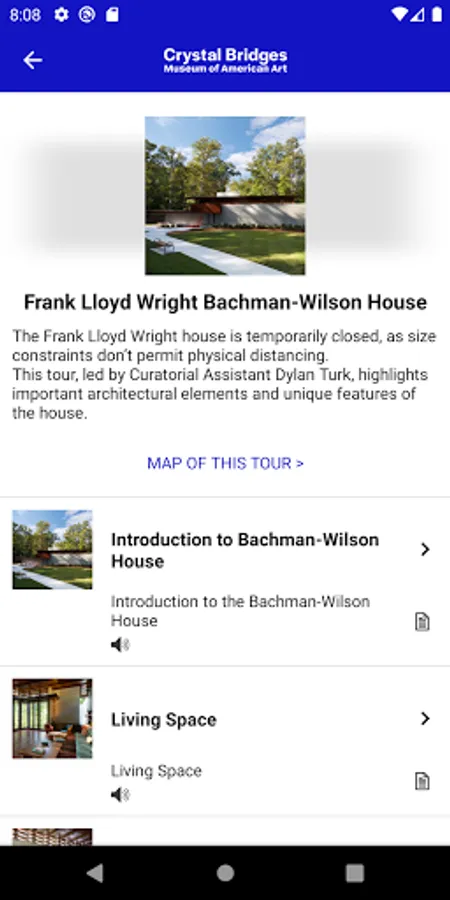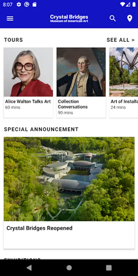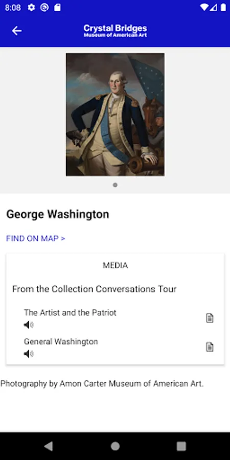 The Crystal Bridges app features a selection of audio and video tours of the museum's permanent collection, arranged around a variety of themes. There is also a "near me" feature that alerts listeners when they are near a featured artwork in the gallery.