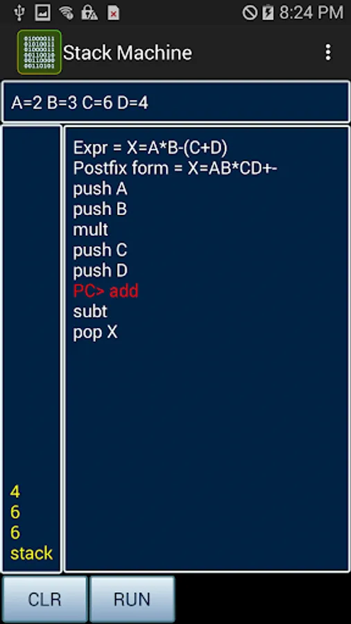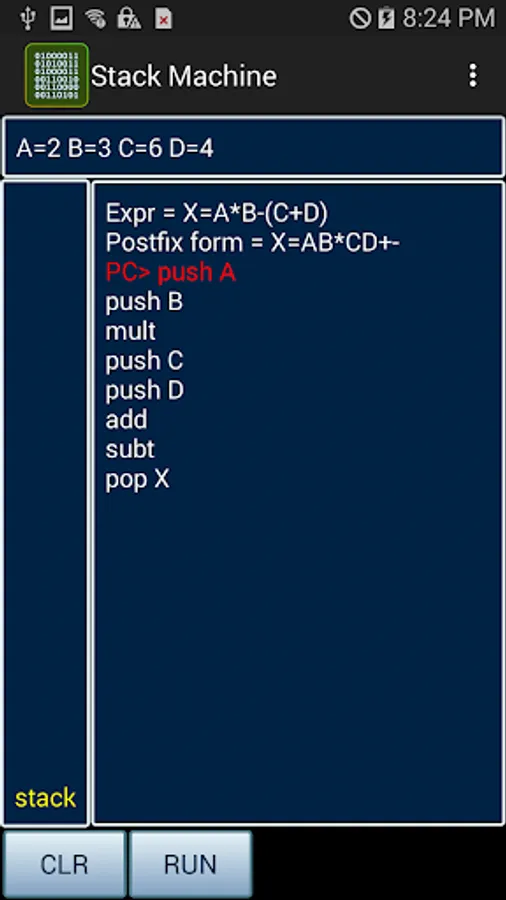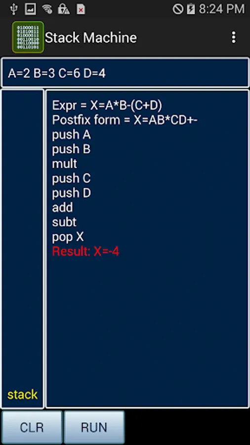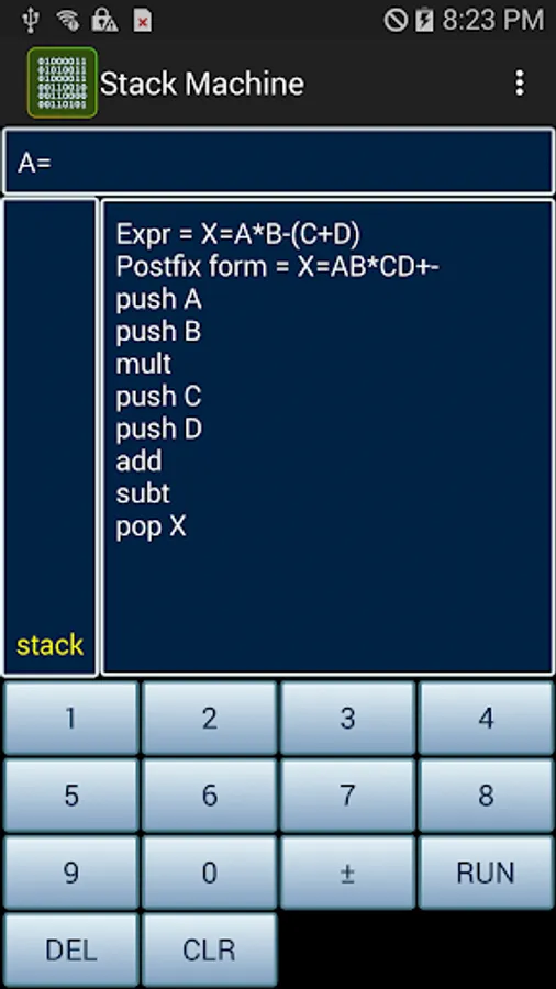 This package provides the UI to support the implementation of a simple stack machine, which accepts algebraic expressions from the user, convert such expressions into the postfix form, and evaluate them. As a demonstration, the machine currently accepts the expression X=A*B-(C+D). To see the stack machine in operation, see the video at https://youtu.be/73EwTyVl9zQ