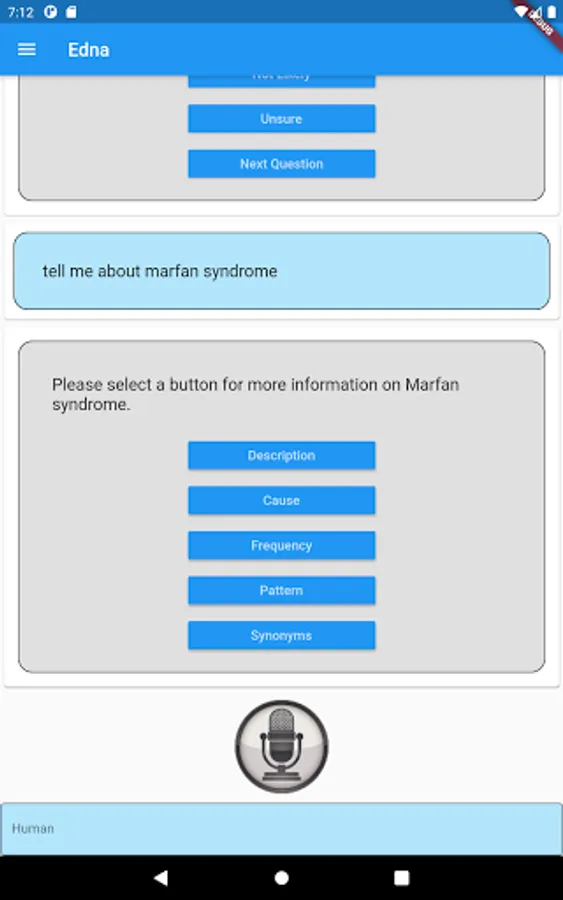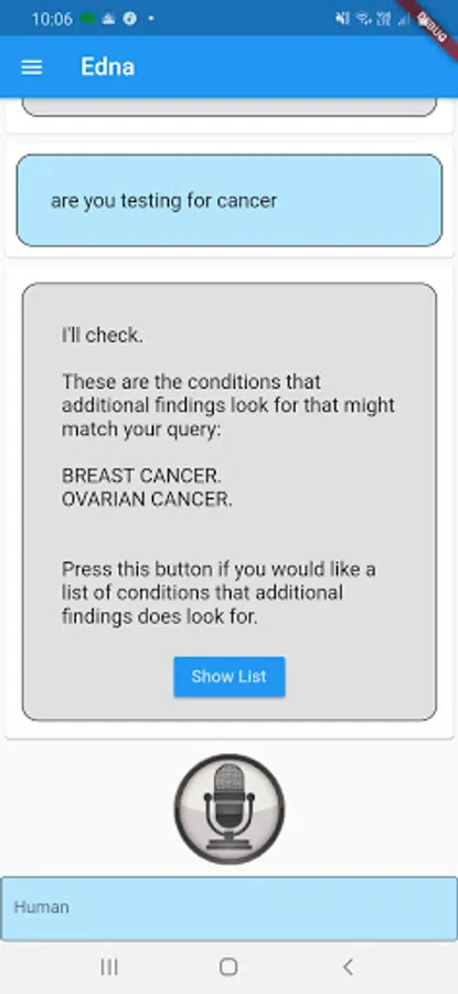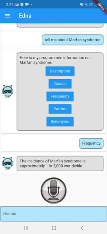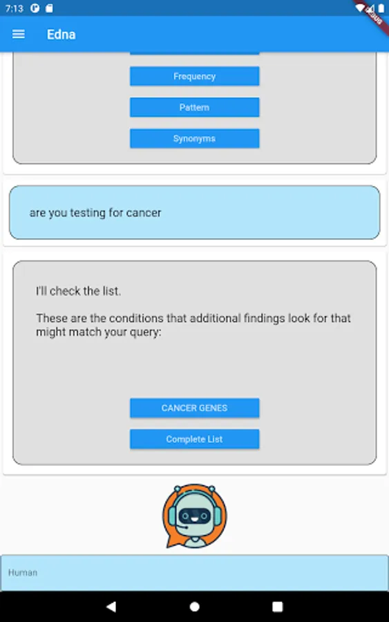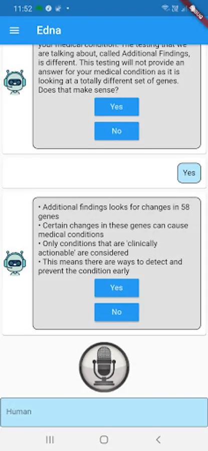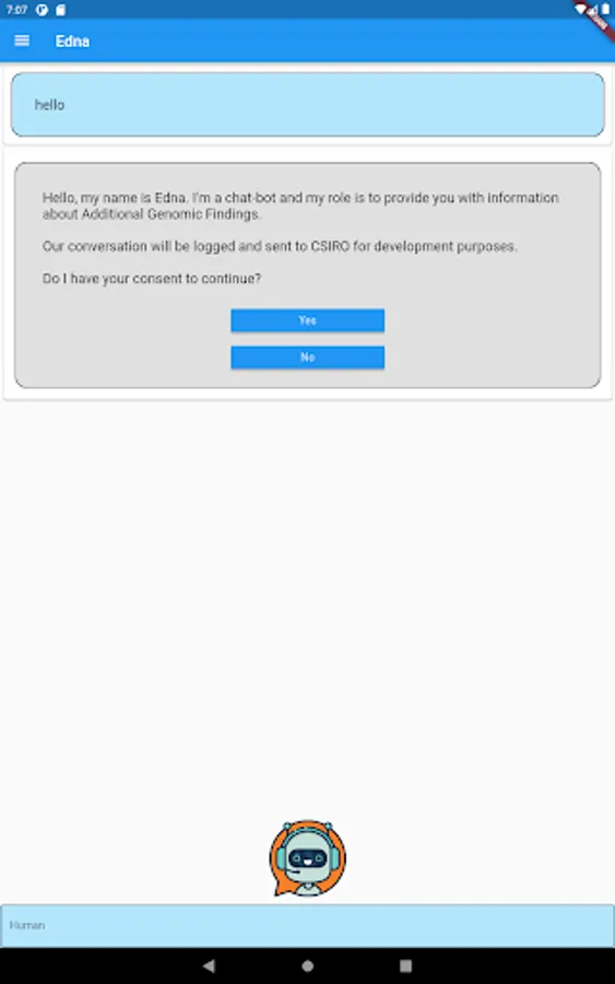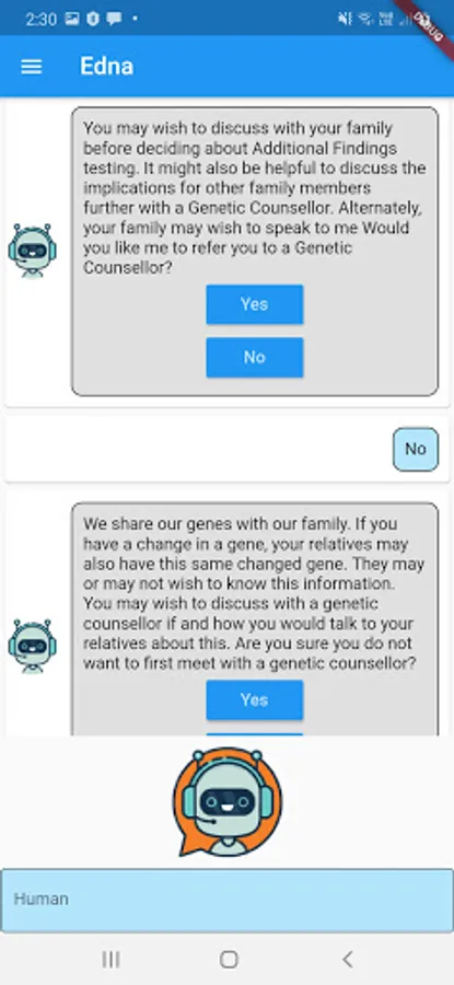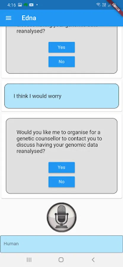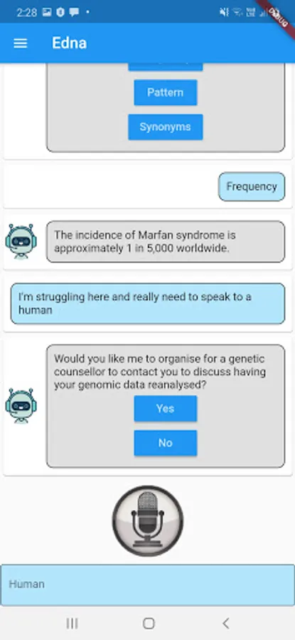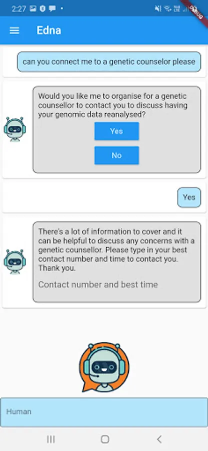 Edna is a genetic counselor chatbot developed by CSIRO in collaboration with the Melbourne Genomics Health Alliance. Edna has been programmed to discuss the implications to genomic testing including insurance, mental health & family relations. She has information on over 1000 genetic conditions, medical terms and frequently asked questions.