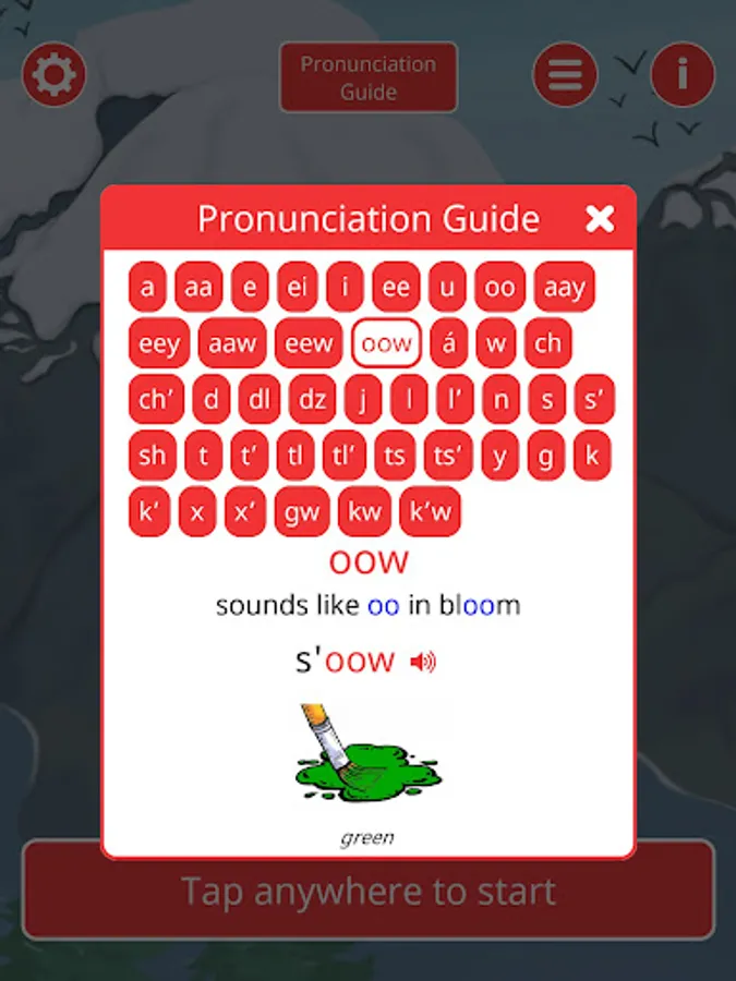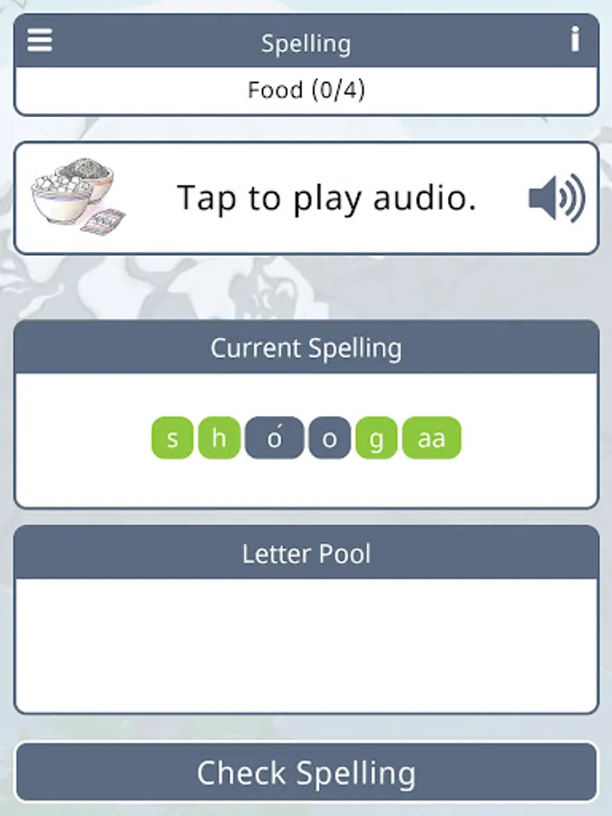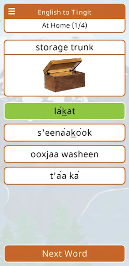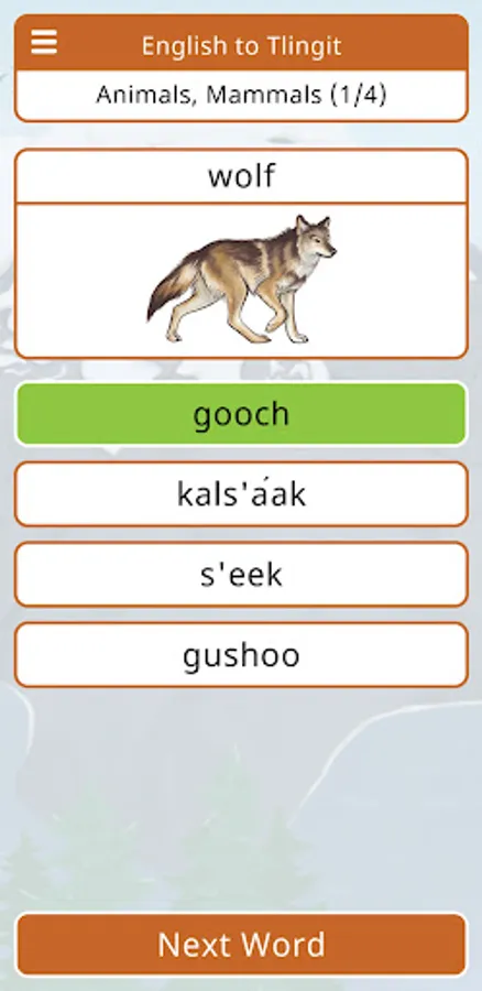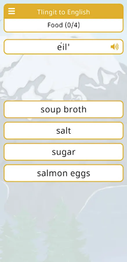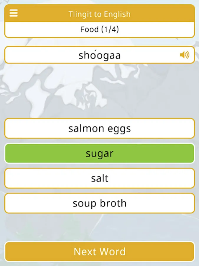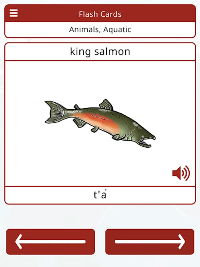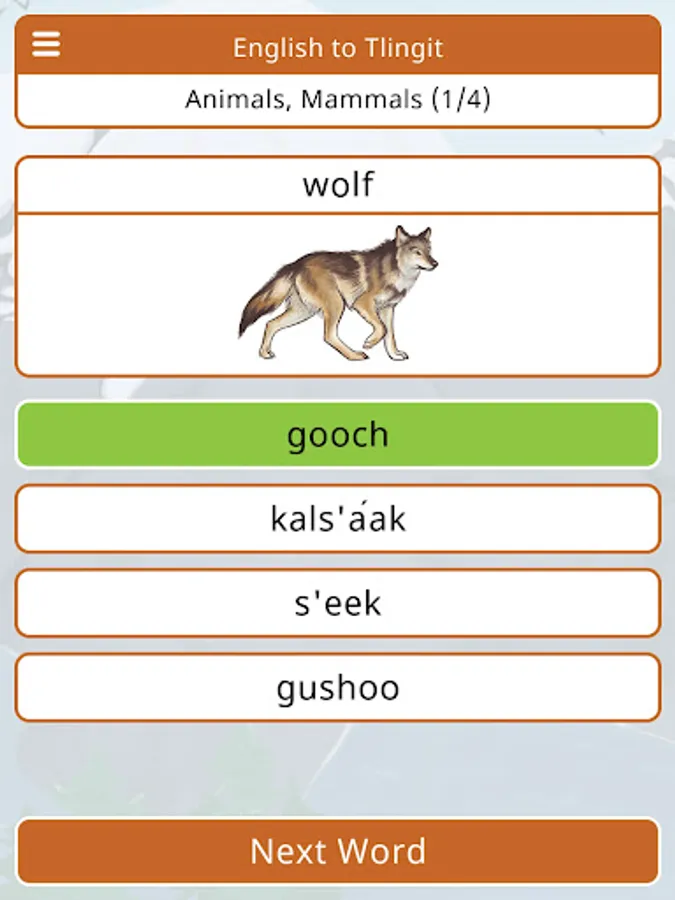 Build your Tlingit vocabulary with the Tlingit Vocab Builder game for your Android phone or tablet. Quiz yourself every day to learn different categories – animals, food, drinks, and more! The app includes: