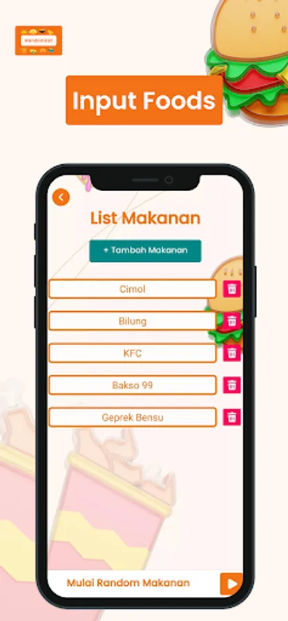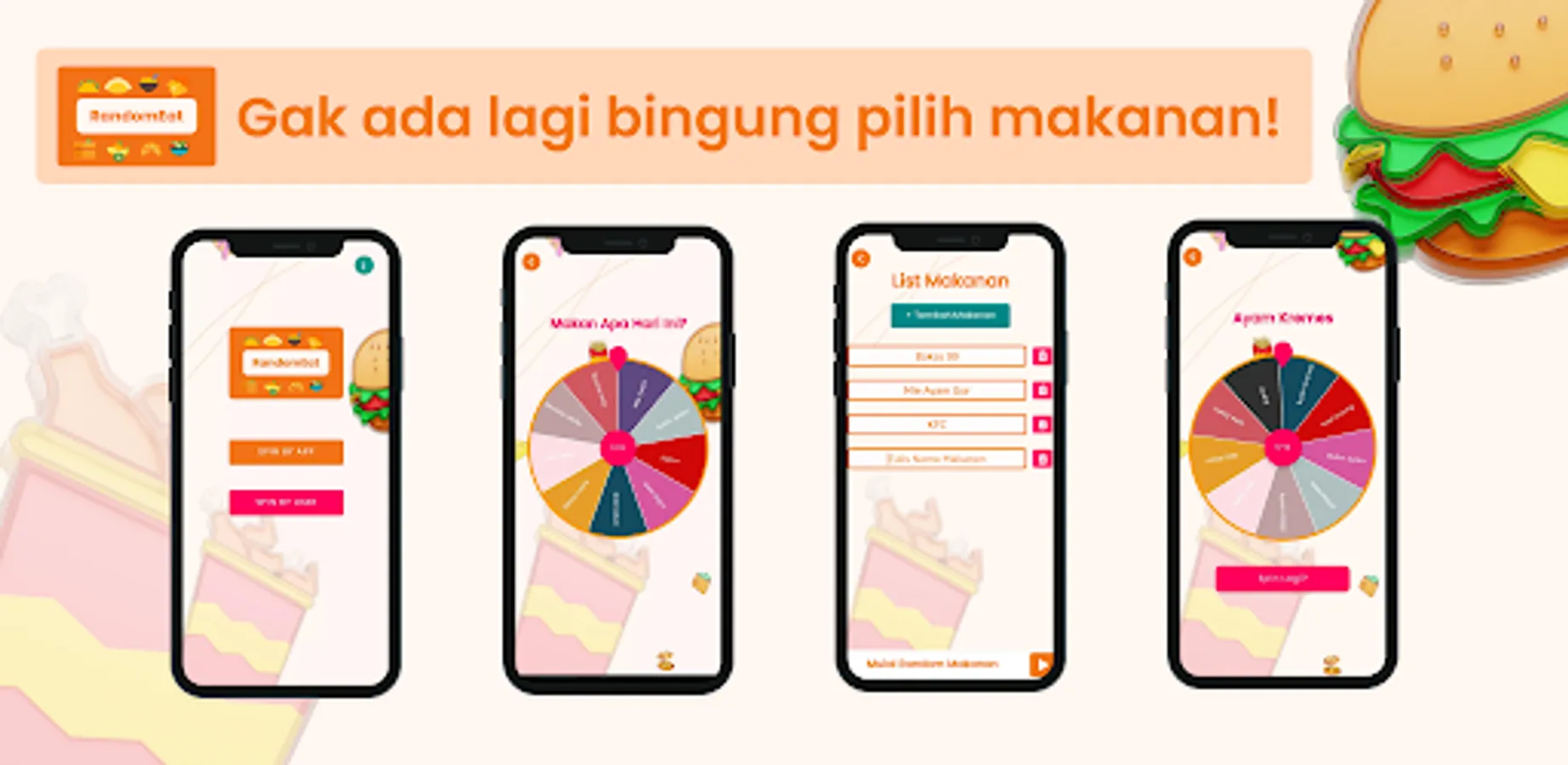 The Random Eat app aims to help people who are confused about what food to eat. This application will randomly choose a food menu for you! The menu that we serve is diverse and of course this food will be easy to find in your neighborhood.