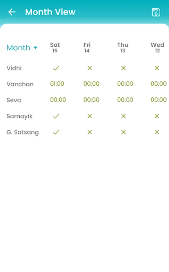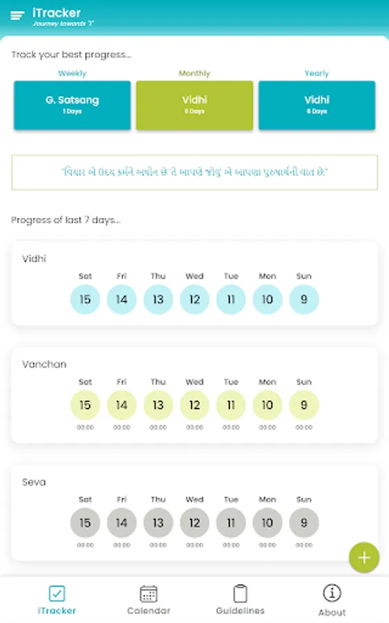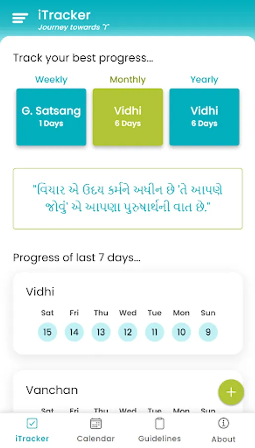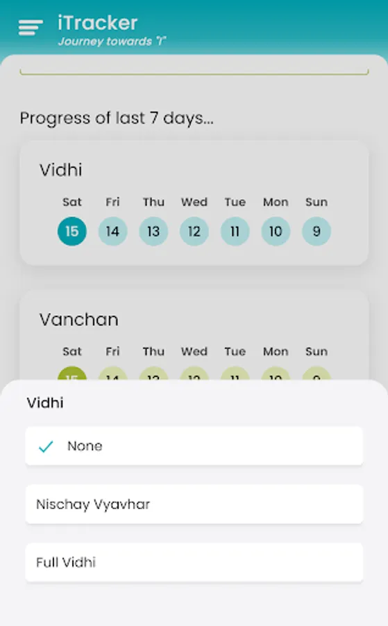 2. Keep track of 5 basic Sadhanas - Vidhi, Vanchan, Satsang, Samayik and Seva.