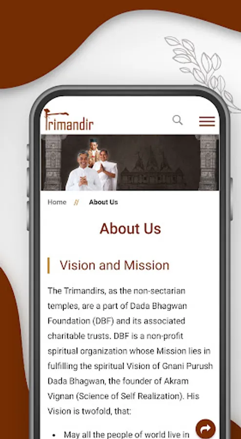 • About the Founder: Introduces the founder of the Trimandir - Param Pujya Dada Bhagwan and His disciples: Pujya Niruma and Pujya Deepakbhai through the following sections: