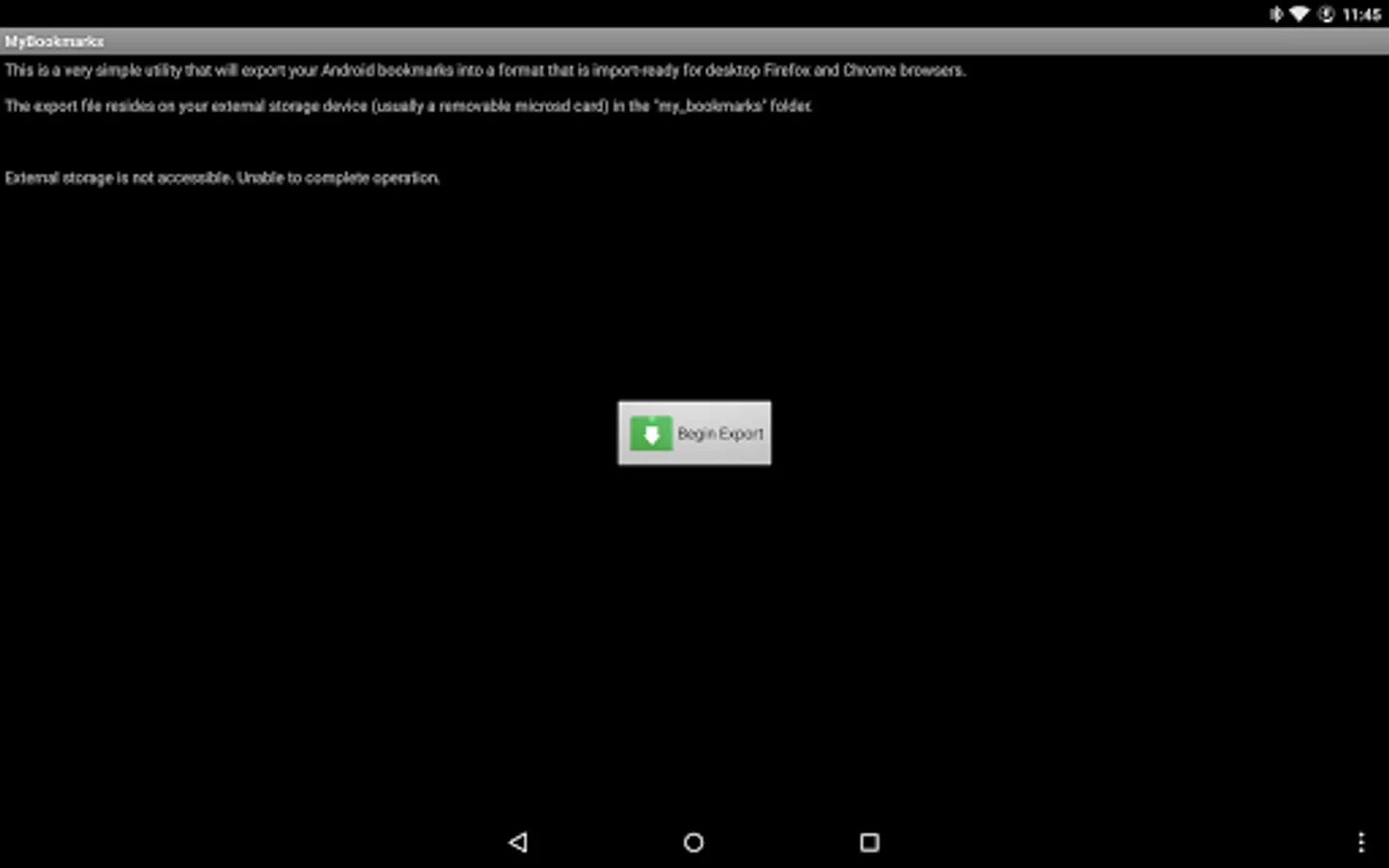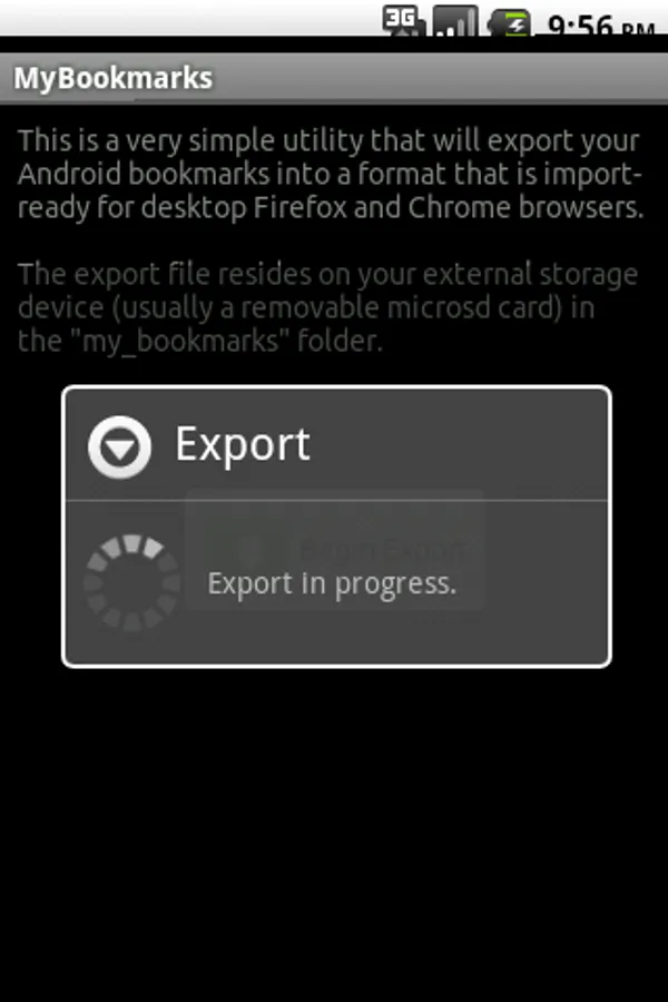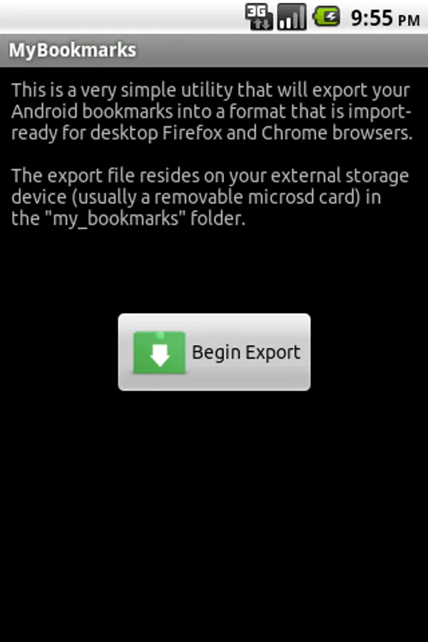 A simple utility to export your Android Browser bookmarks to SD in a format that can be imported to desktop Firefox and Chrome browsers.
