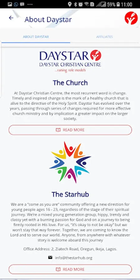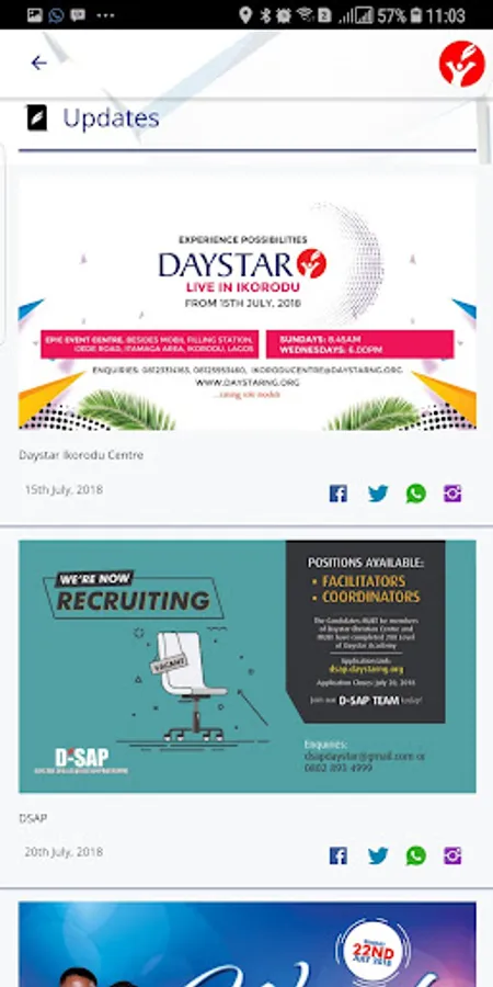 Daystar has evolved over the years, passing through series of changes required for more effective church ministry and by implication a greater impact on the larger society. You can Connect your online community to the Word! through Sharing of church event banners through Facebook, Twitter, Instagram & WhatsApp.