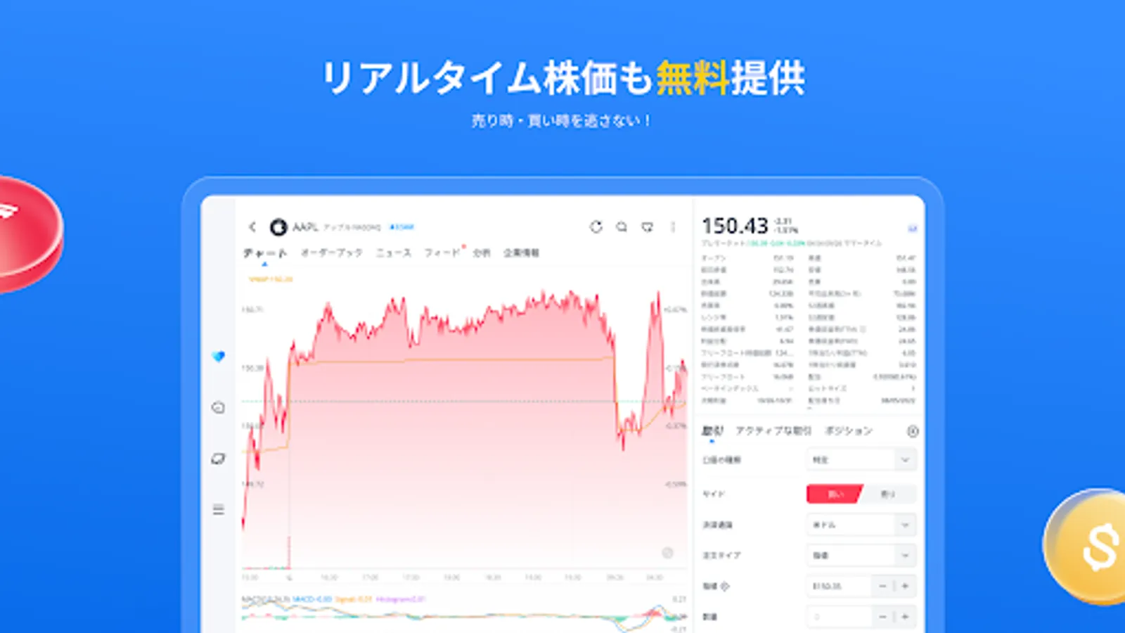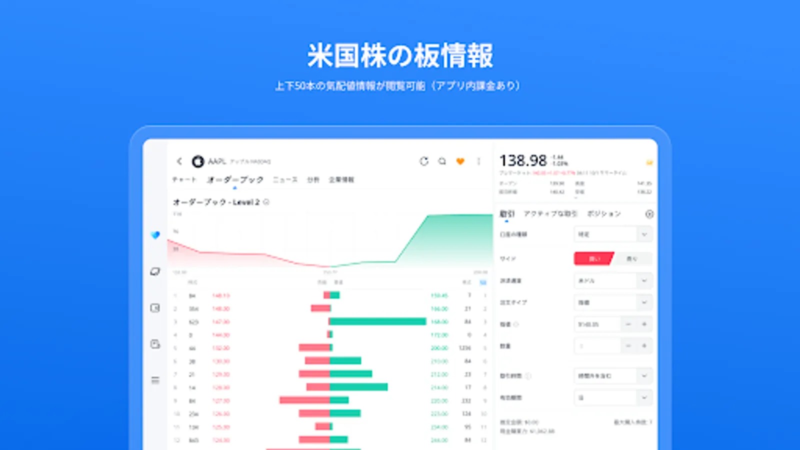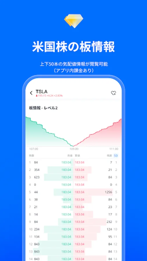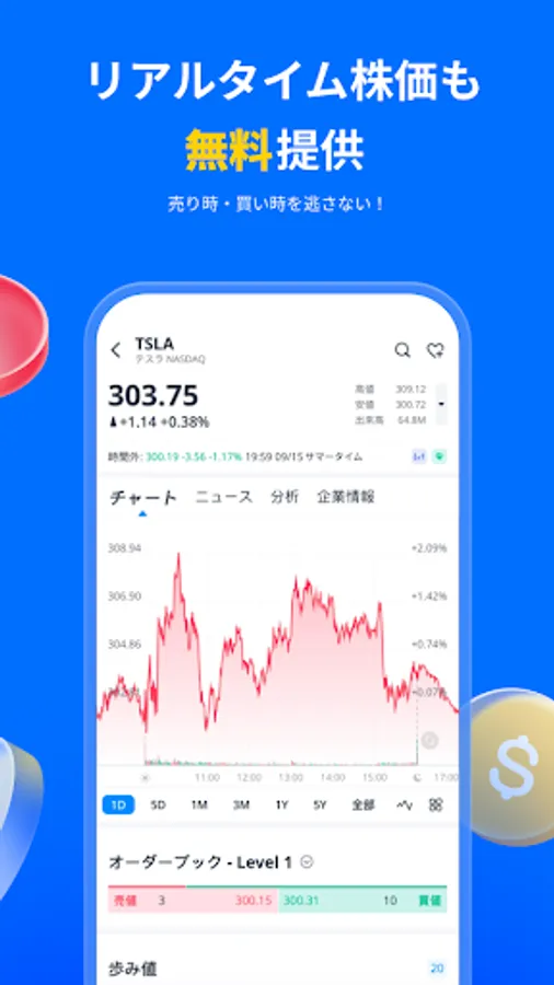 You can view real-time stock prices, charts, and quotes for all stocks handled by our company. You can also subscribe to the US stock market depth (Nasdaq Total View) separately within the app.