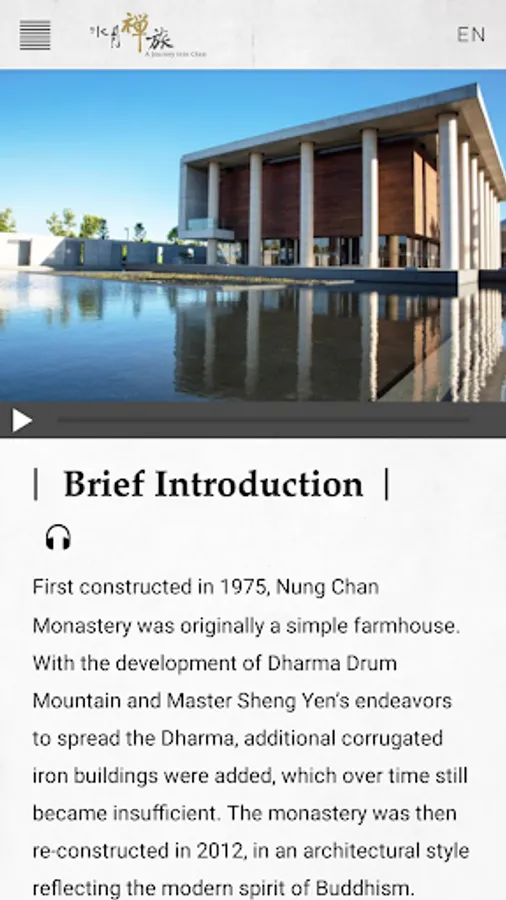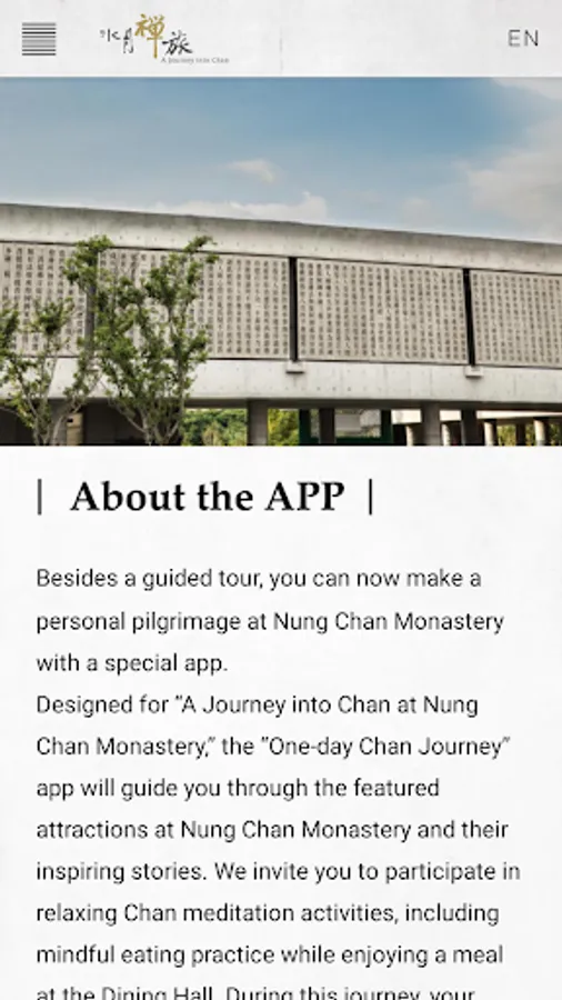 農禪寺導覽APPBesides a guided tour, you can now make a personal pilgrimage at Nung Chan Monastery with a special app.