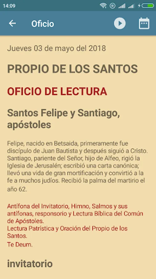 - Liturgy of the hours (Office of Readings with the included biennial lectionary, Lauds, Intermediate Time, Vespers and Complete).