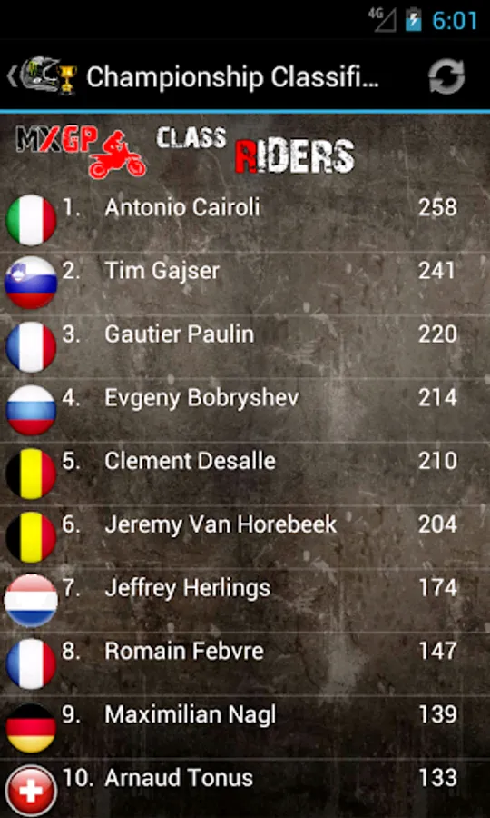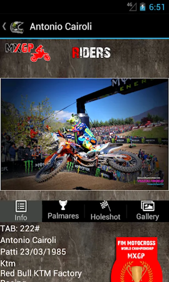 Hi i'm Bartolomeo Berrino and i develloped an applications for allows you to follow the championship FIM Motocross MXGP-MX2-WMX-EMX125-EMX250-EMX2T-EMX65-EMX85 with immediate updates on the races, charts and highlights of the races , informations about the riders and official news.In the new version we have made a mega graphic restyling and added many sections more to engage and excite more and more users to the world of Motocross.Nella new version you can find all the news updated daily on the world of motocross riders in the more you can see over the info and palmares of each pilot also magnificent gallery made available for you to Angelo Vezzoli who helped me to increase the content of this beautiful application that can not miss in your devices.