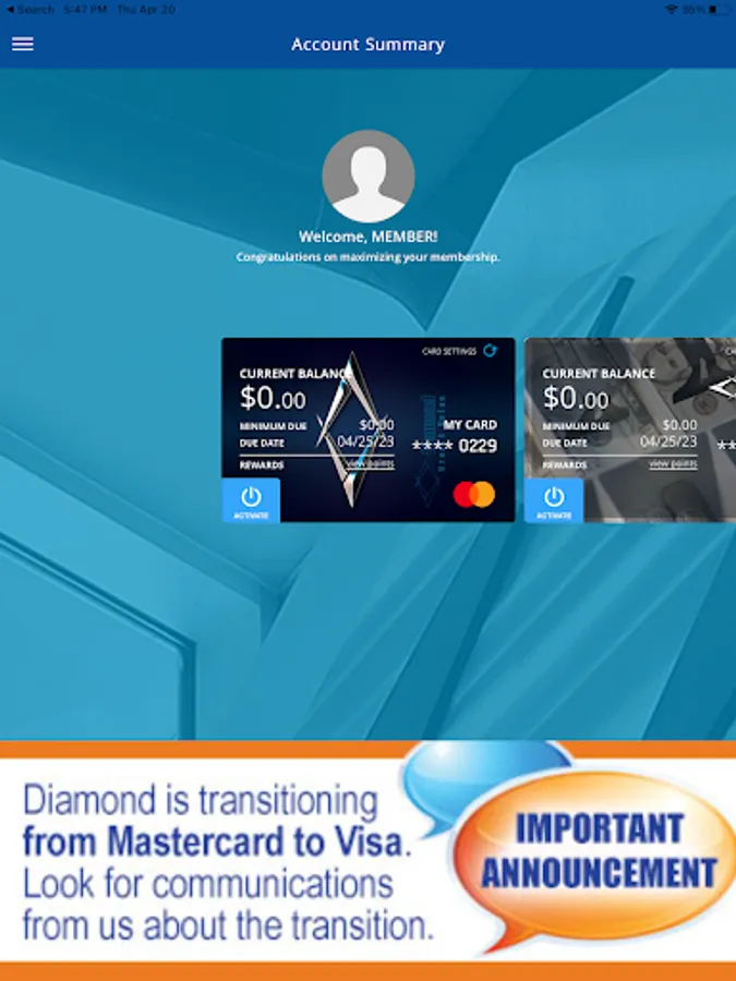 Enjoy easy management of your Diamond Credit Union credit card anywhere with the Diamond Visa Credit Card app. This app offers a convenient way to: