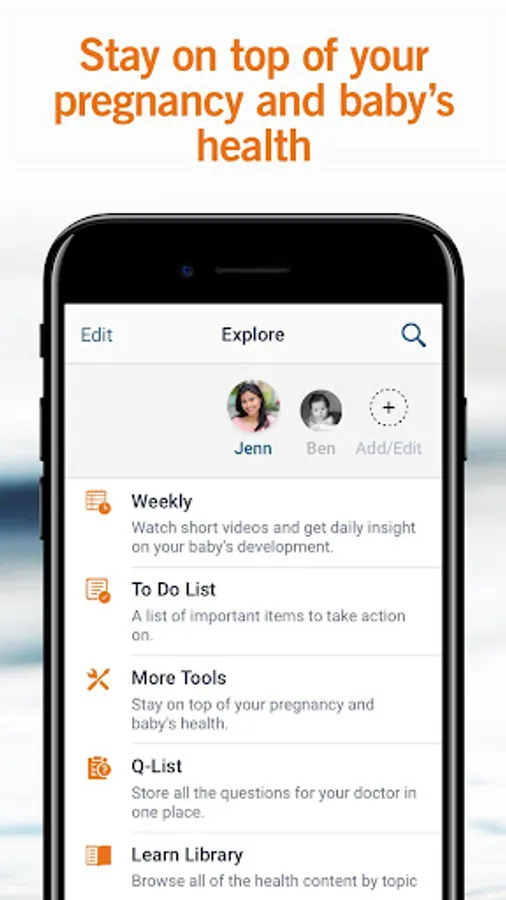 • Download the app and create a profile for your pregnancy, toddler, or newborn.