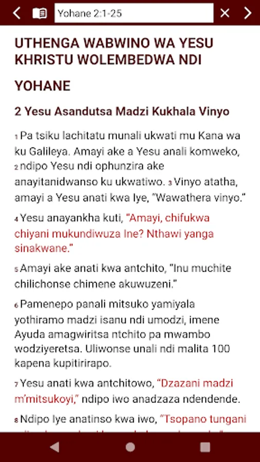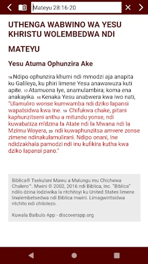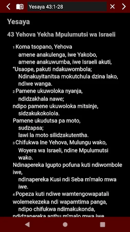 The Light Bible offers an Open Chichewa Bible text in a small, fast app with the whole bible available offline...