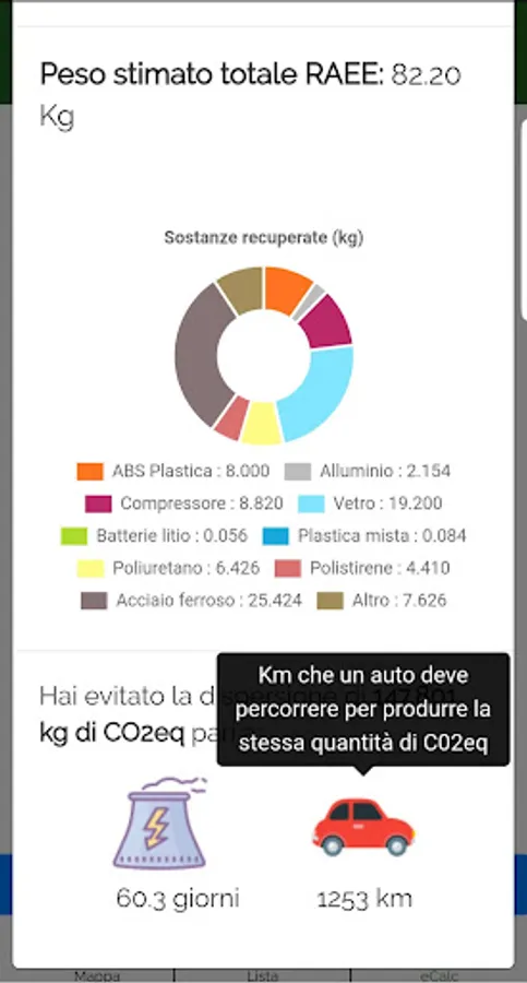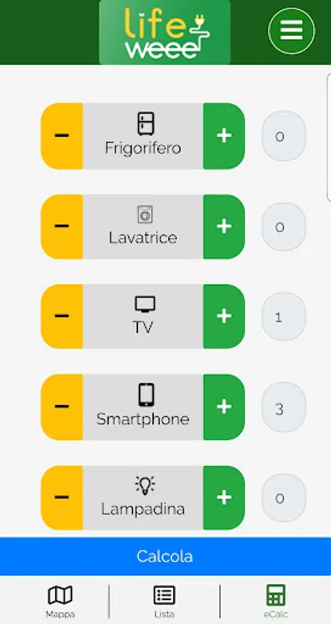 - Use a calculation to verify the impact on the environment given by the correct disposal of your waste: enter the number and type of electronic devices to be disposed of and the app calculates the quantity of disposed substances and CO2 saved thanks to the correct disposal;