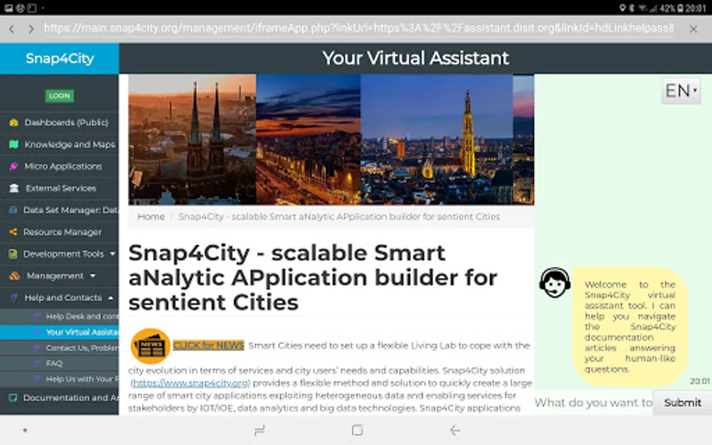 Snap4City is a smart city IOT/IOE (internet of things, everything) platform and tools, which is 100% open source and includes development and production tools based on Km4City (https://www.km4city.org ) which in turn has been developed in Sii-Mobility smart city national Italian project. Snap4City platform has been developed by a team including University of Florence (DISIT Lab https://www.disit.org ), University of Milan and Snap4 SRL. Snap4City is compliant with more than 50 different protocols and standards, it is also an official platform of Fi-Ware, an official library of JS Foundations Node-RED.
