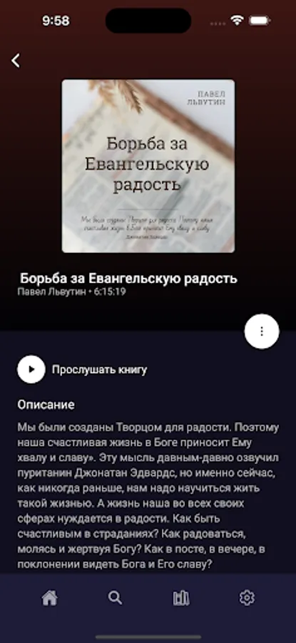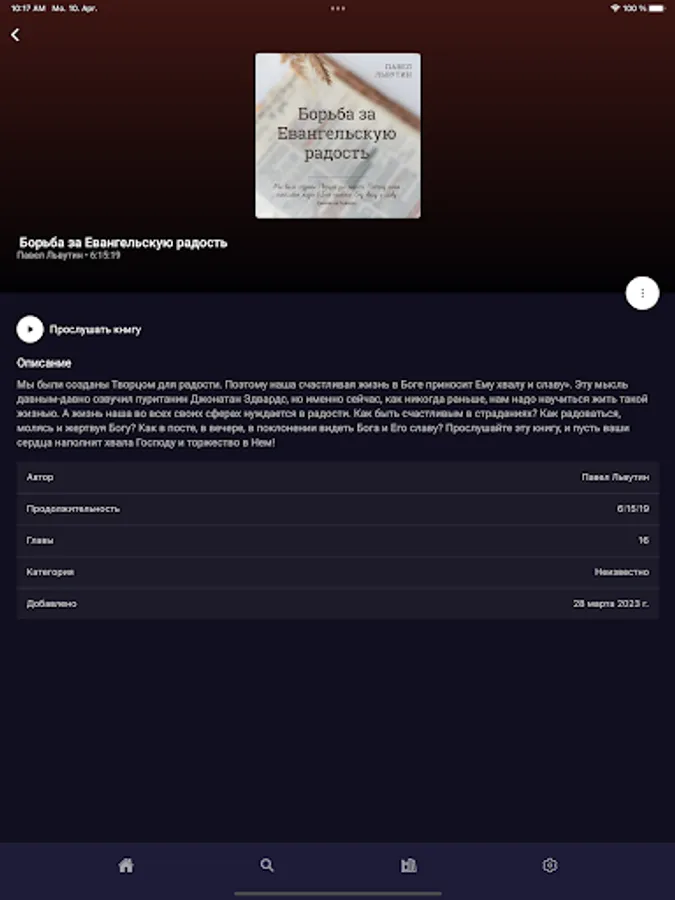 Blagoya Vesti publishing house in collaboration with HeartCry ministry offers you a selection of sound bible audio resources in Russian. In our application "Audioword" you will find books by both long-gone authors (Puritans, Charles Spurgeon, John Ryle) and our contemporaries (John Piper, John MacArthur, Paul Washer and many others).