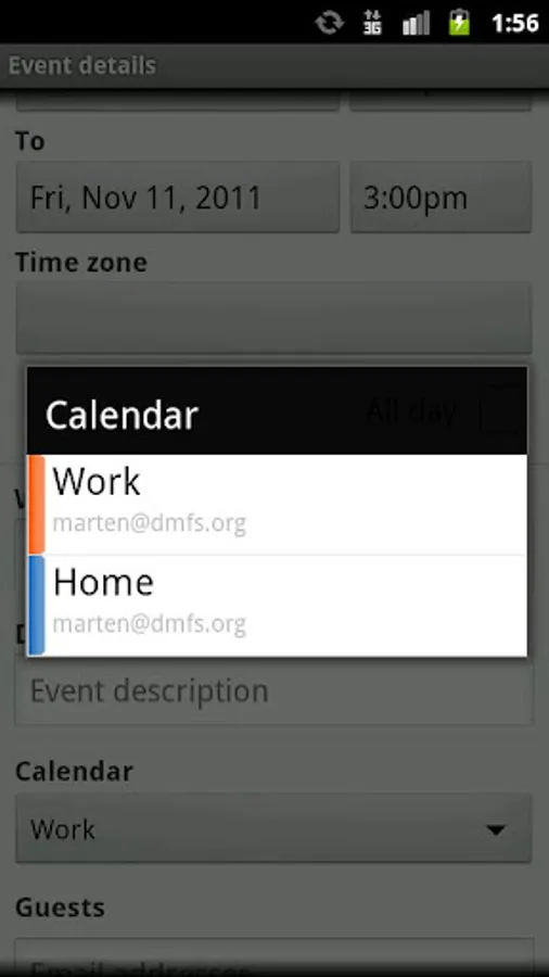 The last screen shot shows the calendar selection dialog of the event editor of the stock calendar app.