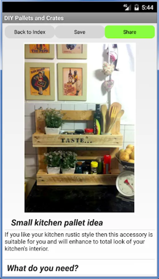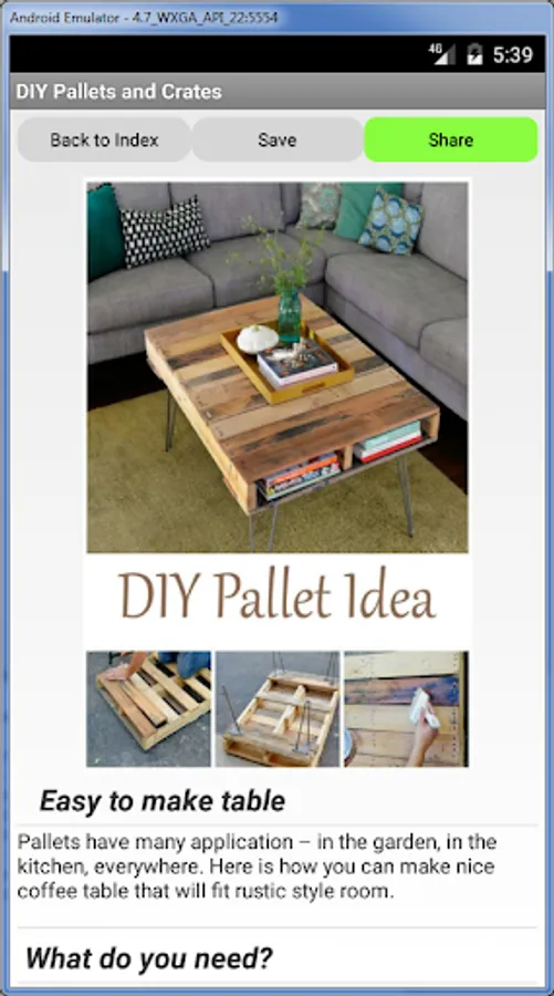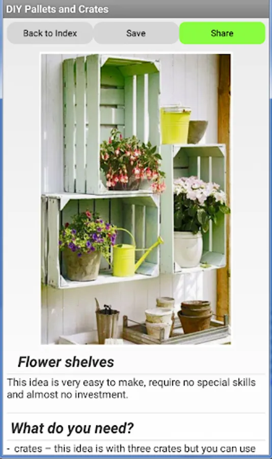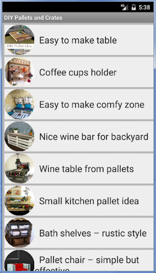 Over three dozens diy pallets and crates ideas are available in this app – storage space idea, worktable for your garage, comfortable sofa with cushions and many more. If you need storage space, then you will love diy crate ideas included in this app.