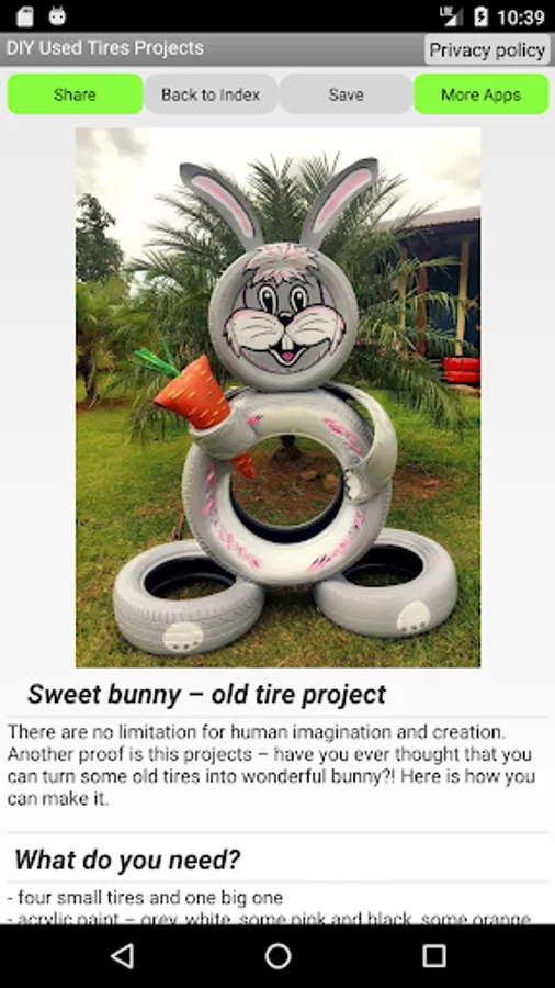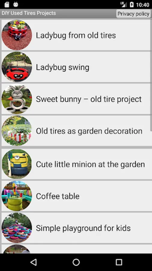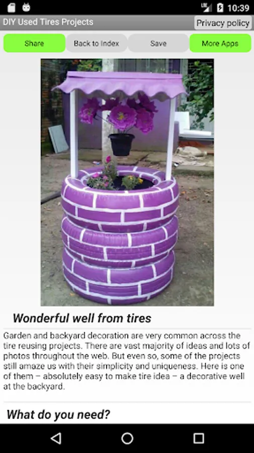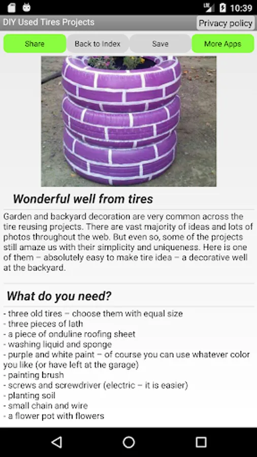 DIY Used Tires Projects is app with lots of projects how to reuse old tires and create wonderful things. Here you will find how to create tire decorations or tire chair, turn some old tires into tire swing or decorate the garden with some nice flower pots made of old tires.