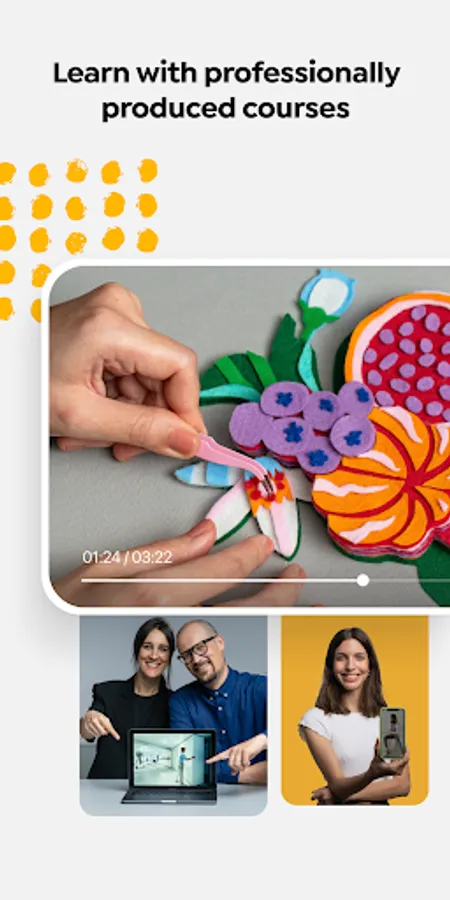 - Craft: explore the world of artisanal crafts with online courses about sculpture, modeling, creative ceramics, papercraft, screen printing, needle felting, amigurumi, macramé, collage, and more.
