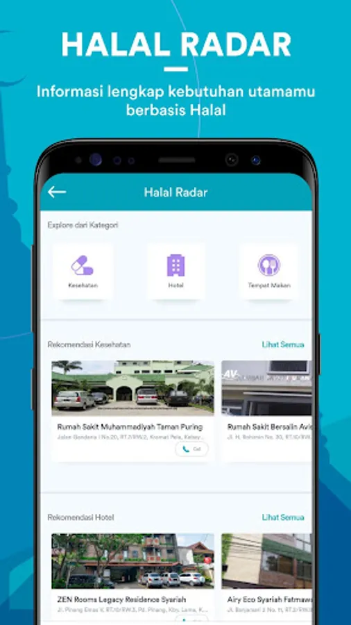 - Halal Radar: displays Islamic places such as Islamic hospitals / Islamic clinics, sharia hotels, list of halal restaurants, lists of Islamic schools and sharia banks around you