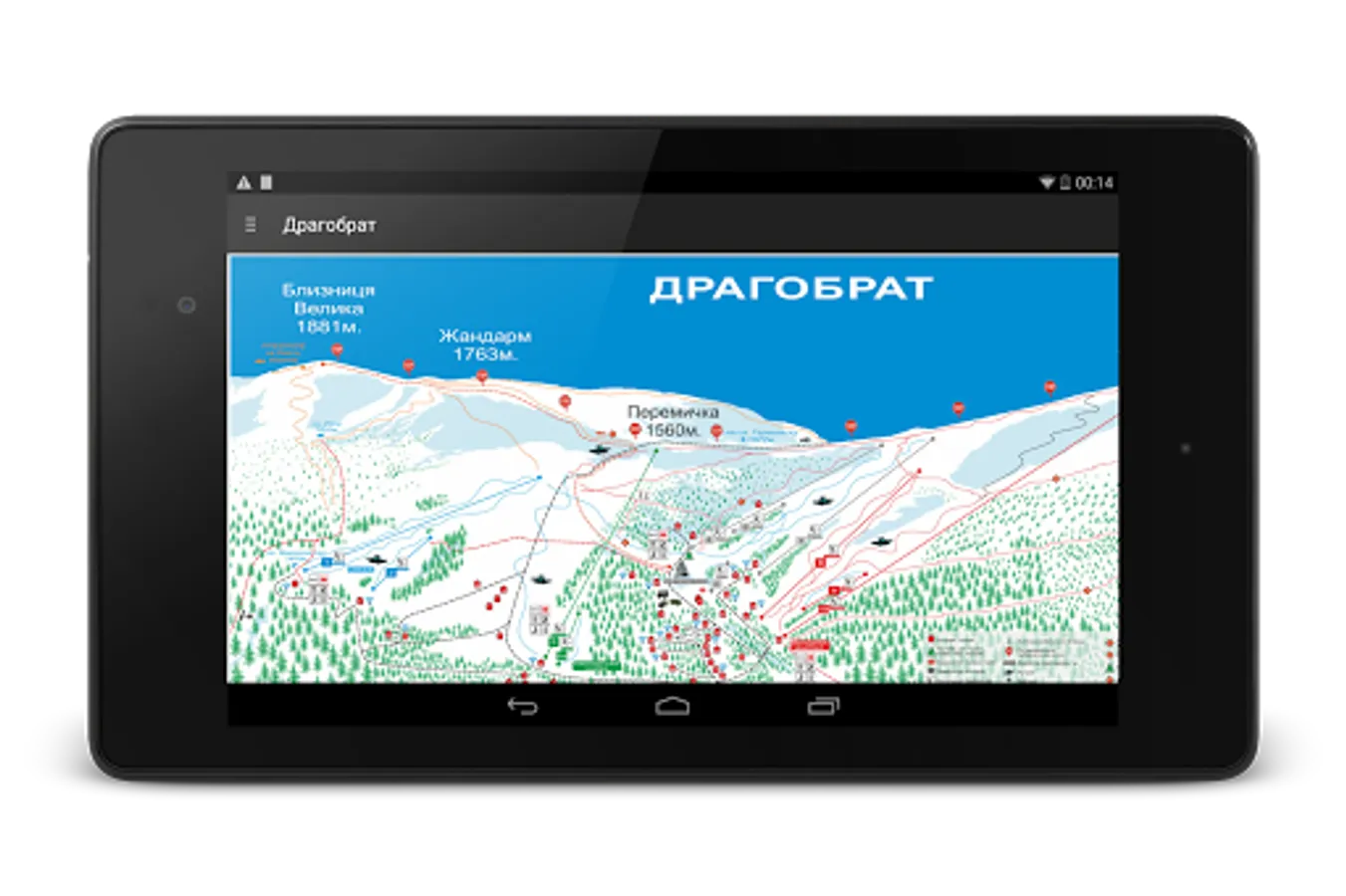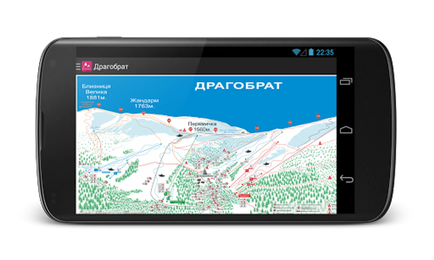 The application allows you to view a detailed map of the slopes, lifts and cottages.