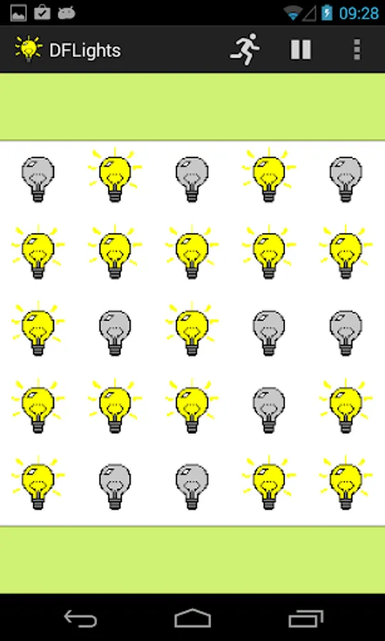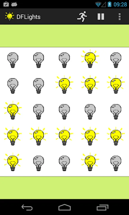 The game "lights" consists of a 5 by 5 grid of lights; when the game starts, all lights are switched off. Pressing one of the lights will toggle it and the four lights adjacent to it on and off. (Diagonal neighbours are not affected.) The game provides a puzzle: to switch all the lights on.