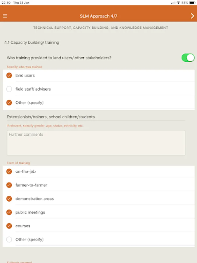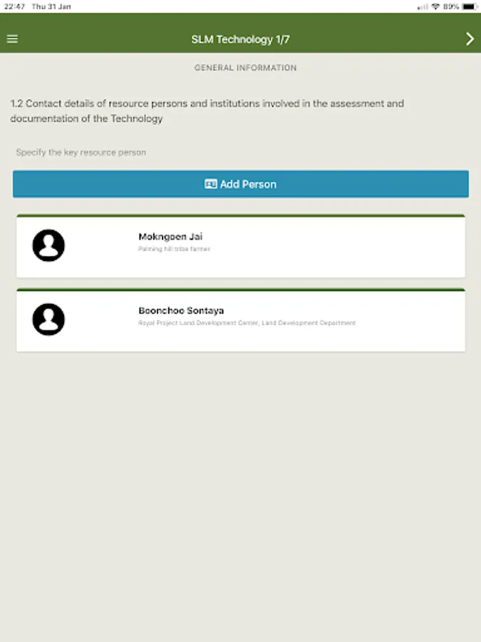 GPS : Identify location, Camera for Photo and Video, Voice record for taking memo note then complier can fill the text/message since the input long description at the field is not convenience. The questionnaires will be stored on the device then user can export and copy/paste to the WOCAT system. The application can be used for QA/QT questionnaires for any place (not restrict to only Thailand.)