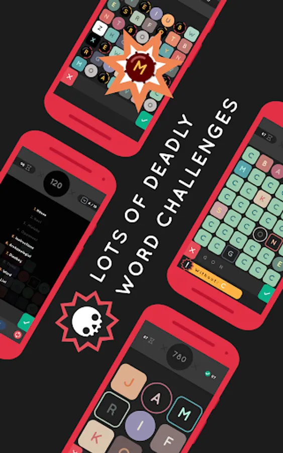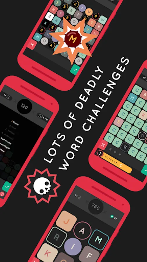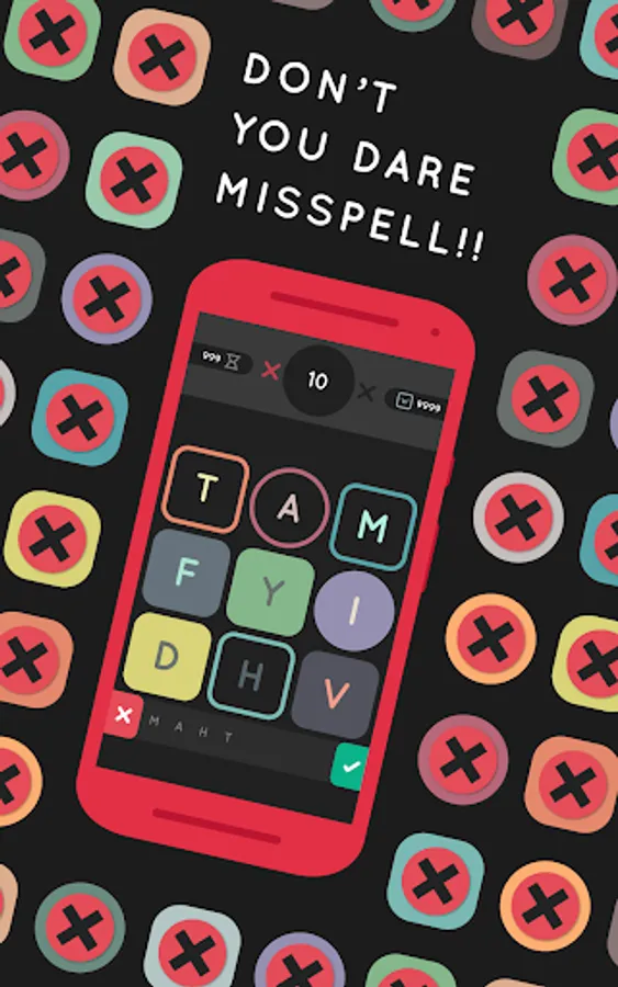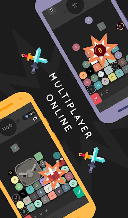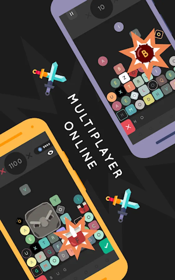 • ONLINE VERSUS MATCHES in real time. Make your friends suffer by writing words and sending them bombs, boulders, freezing tiles and more. The first one to reach the top loses the game!