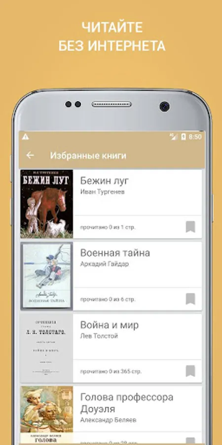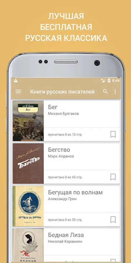 The appendix "The Best Books of Russian Classics Writers" allows you to keep a list of selected books, use a convenient search by names and authors. The application remembers your current reading progress and allows you to return to the last page quickly and conveniently.
