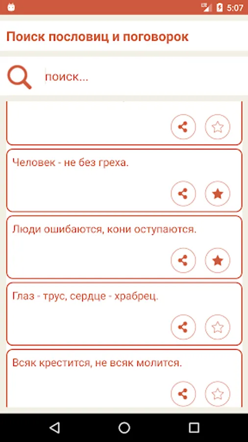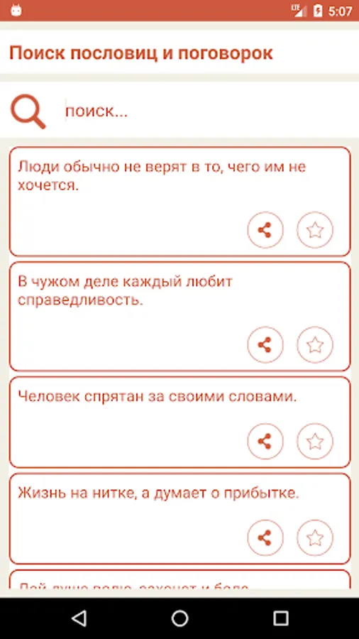 The application allows you to use as a categorization and keyword search phrases and logical. Found proverbs and sayings you can add to your favorites to quickly recall the statement of interested in the future of the main application menu. Also, the program allows you to quickly share the proverb in any social networks. You can share interesting proverbs in a single click in such popular social networks as VKontakte, Google+, Odnoklassniki, World of Mail.ru, in the messengers (WatsApp, Viber, Skype) and other social programs.