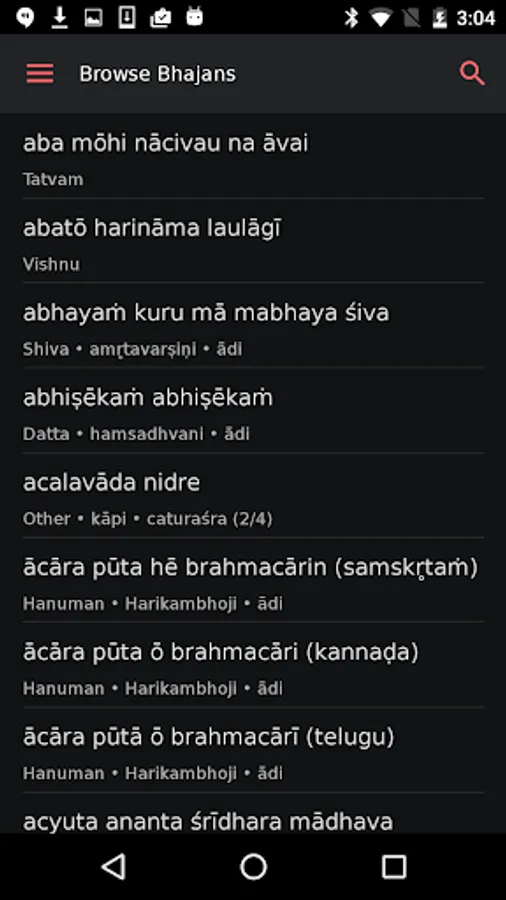 You can browse the bhajan list by deity or album (if it was released on a CD).