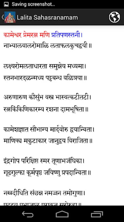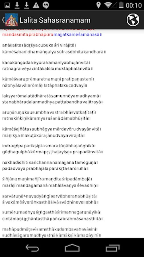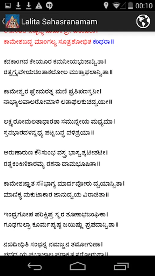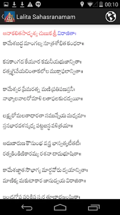 This app helps you recite the Shlokas along with Sri Swamiji by providing text for the entire Lalita Sahasranama in English, Telugu and Kannada languages.