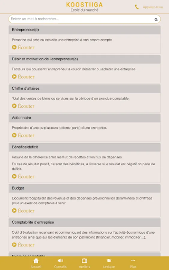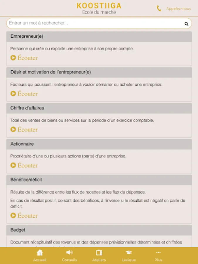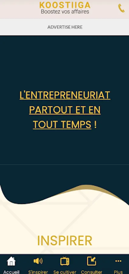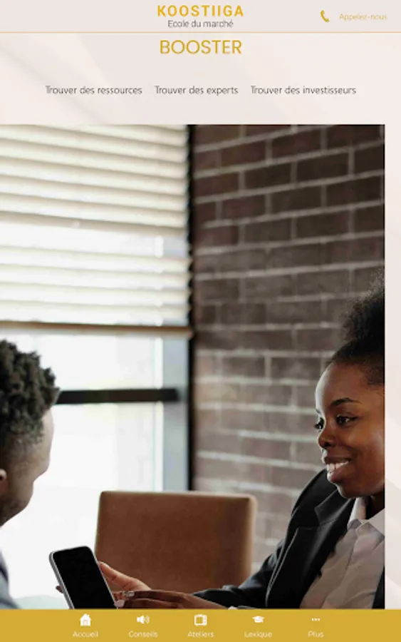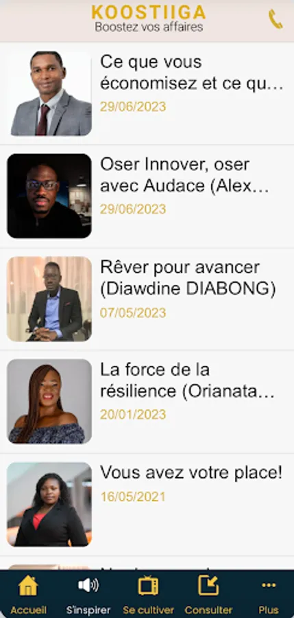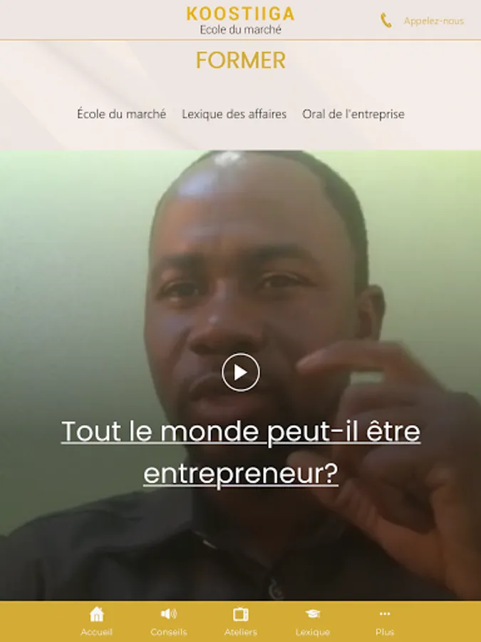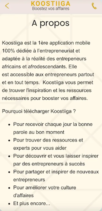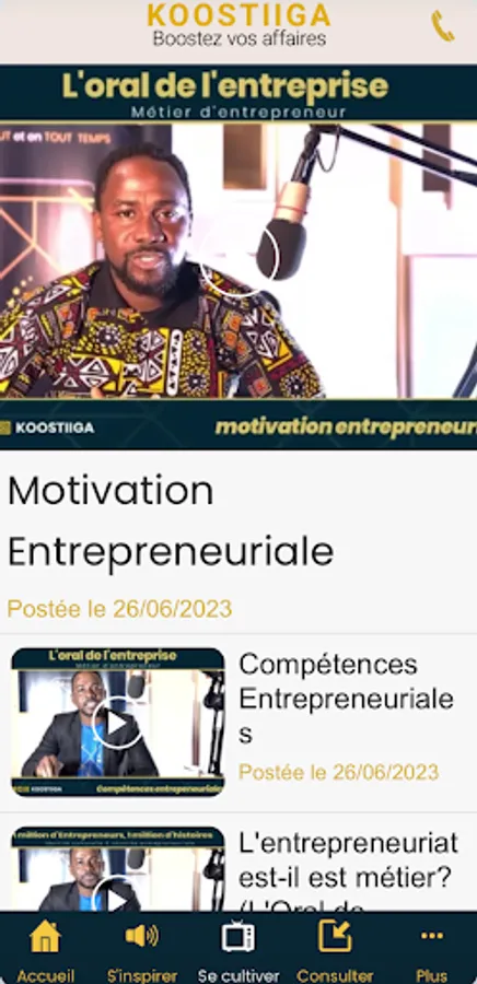 Koostiiga APP is the 1st mobile application 100% dedicated to entrepreneurship and adapted to the reality of African-inspired entrepreneurs. It is accessible to entrepreneurs anywhere and at any time. The Koostiiga mobile application nourishes inspiration, improves business culture and promotes innovation thanks to adapted technologies.
