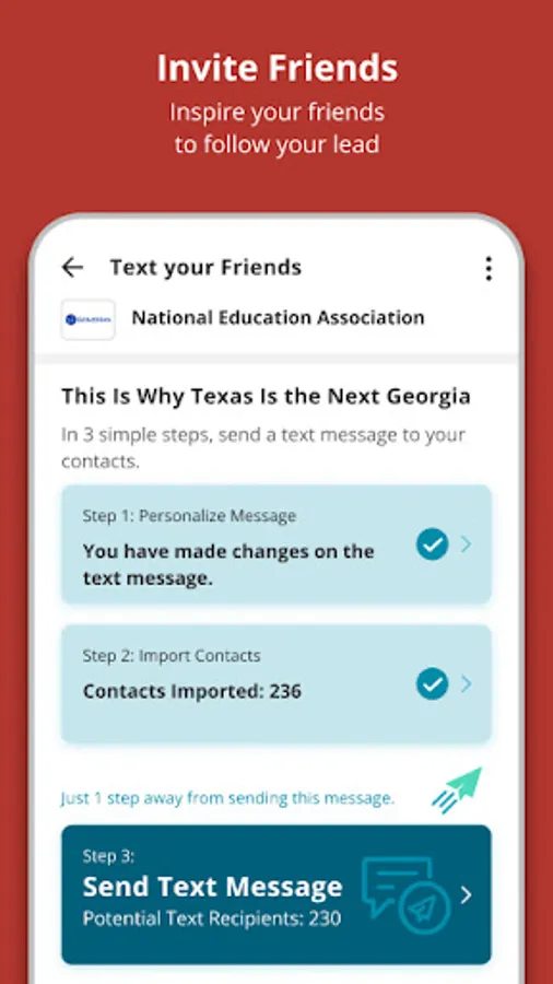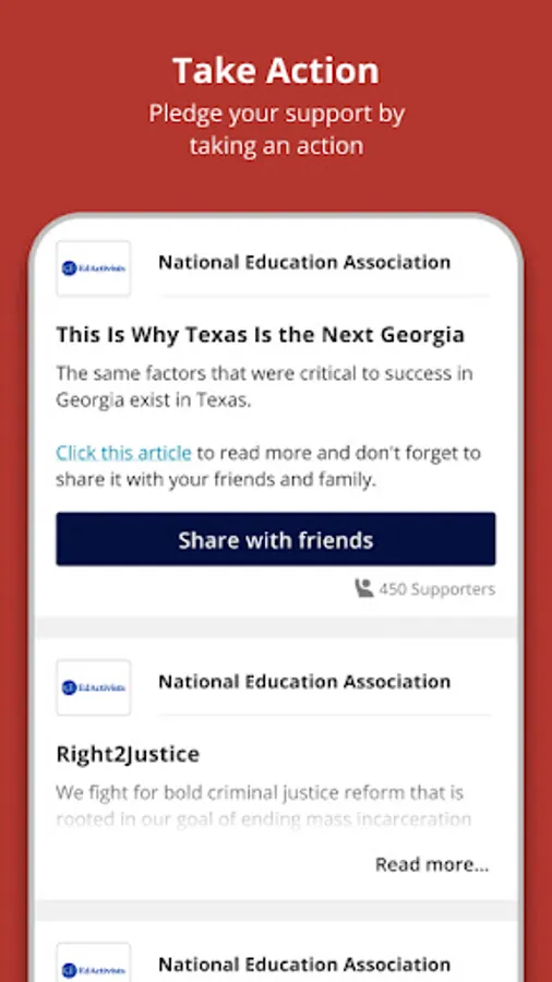 EdActivist is NEA’s digital campaign headquarters, providing a one-stop-shop to mobilize your network to support public schools and students by advocating for pro-public education candidates and causes. People tend to take advice from people they know and trust—that’s why we created EdActivist, so you can even engage your friends and colleagues via social media, text, and email, quickly and easily from one app.