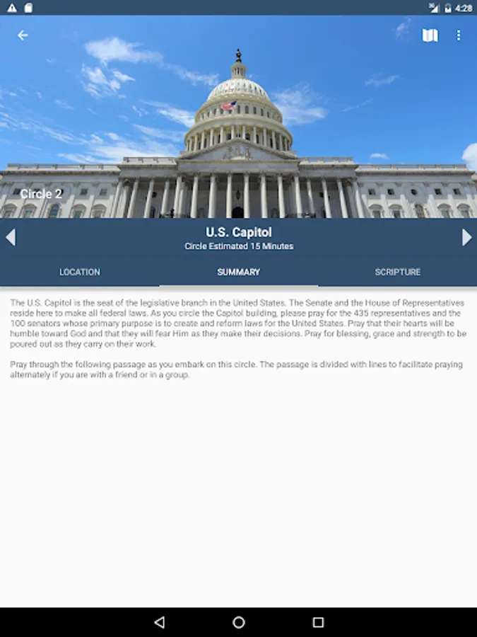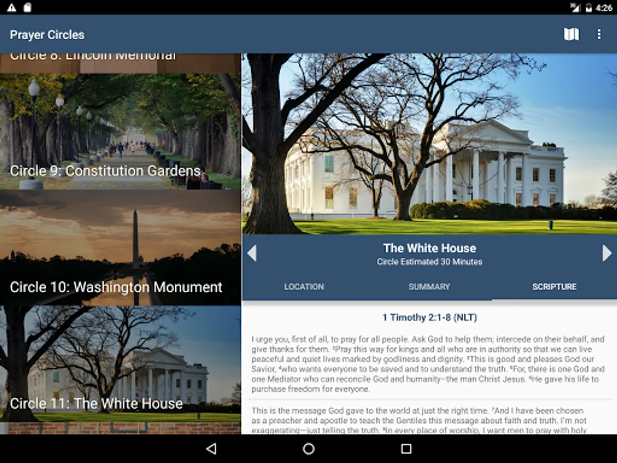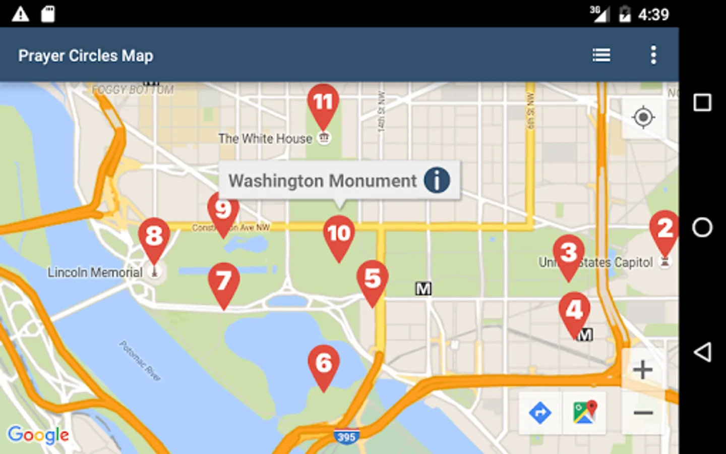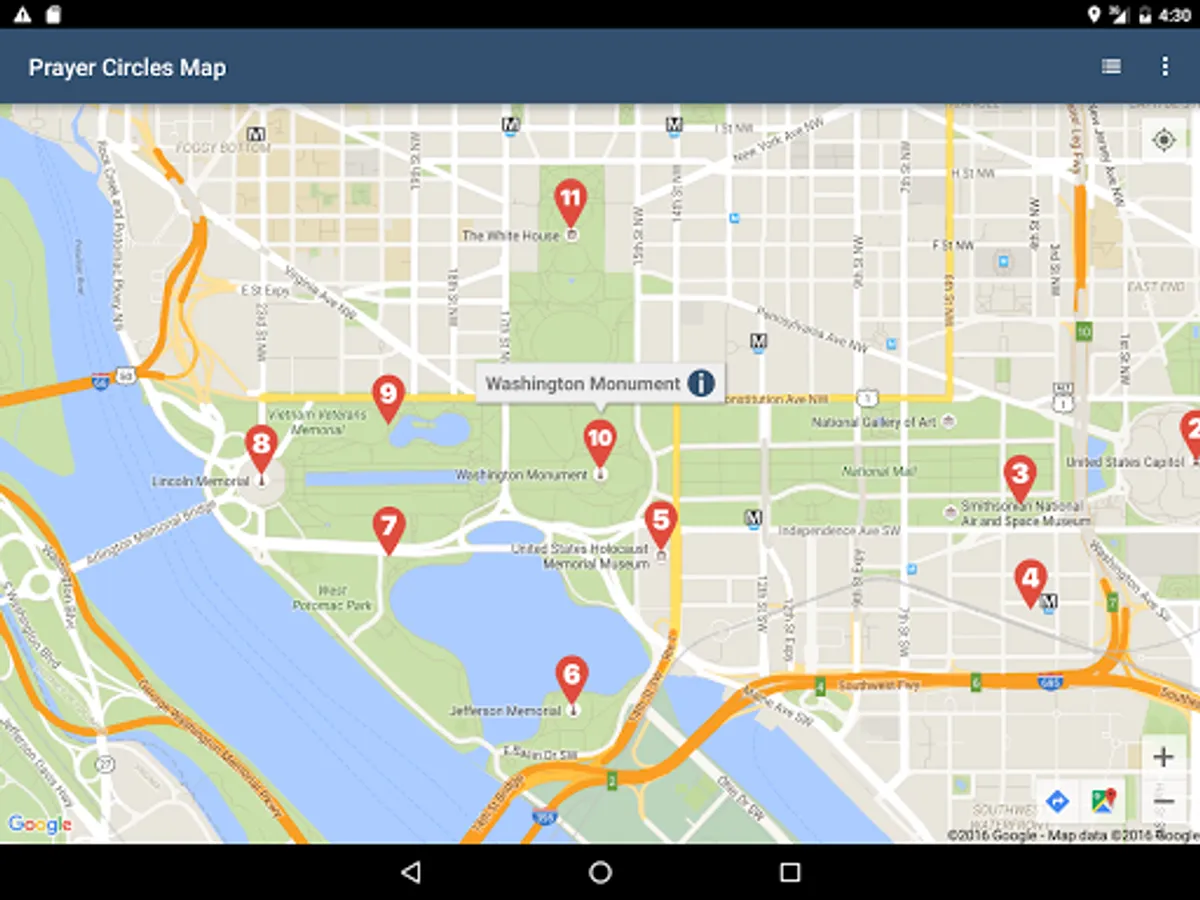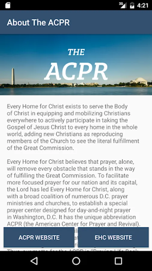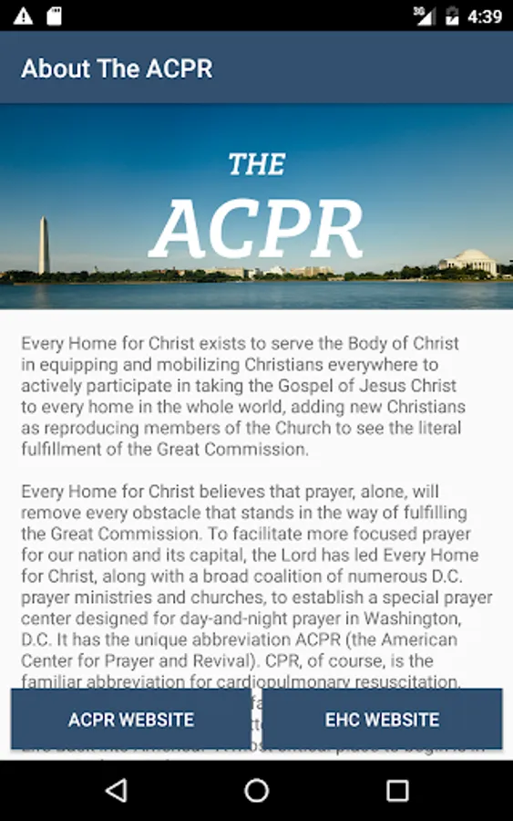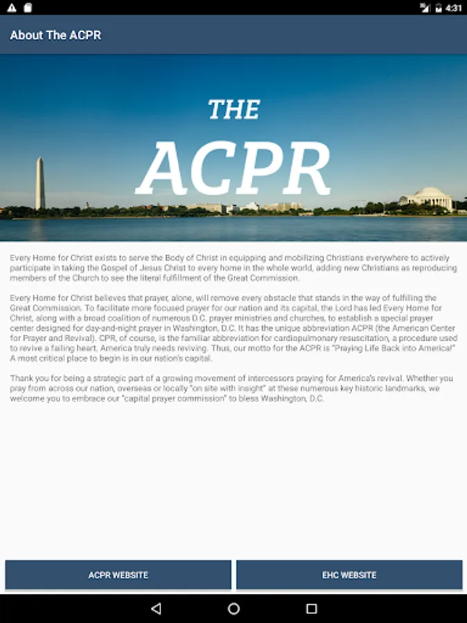 The American Center for Prayer and Revival (ACPR), a ministry of Every Home for Christ, has created this app to be your guide as you pray circles around Washington, D.C.’s famous monuments and institutions. Each landmark has a uniquely symbolic focus for prayer. As you go, use the helpful passages of Scripture that have been carefully selected for each site.