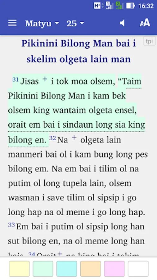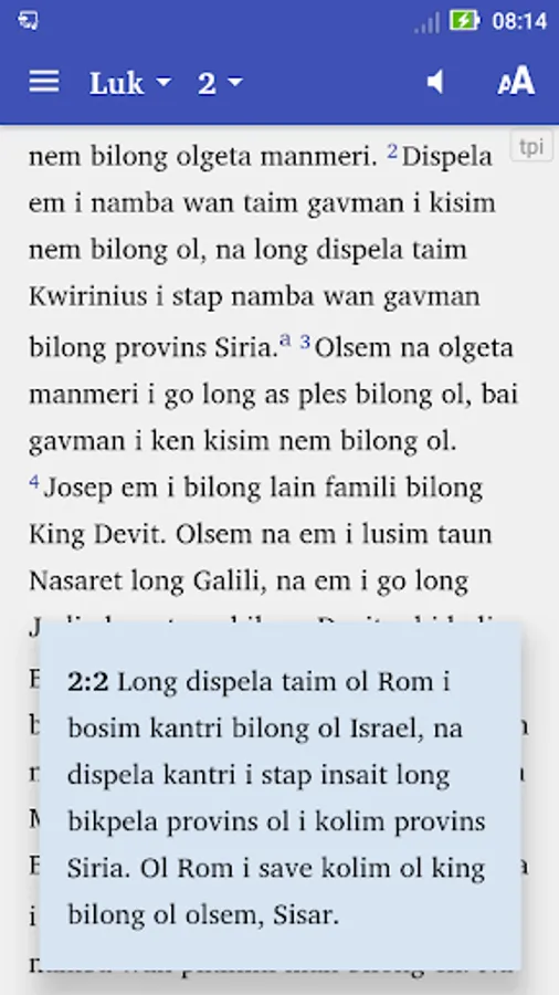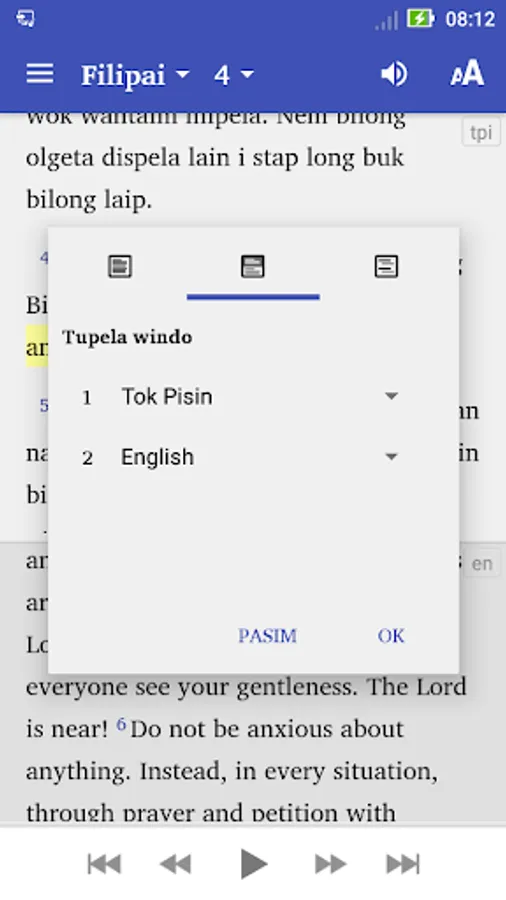 The Tok Pisin New Testament can play phrase synchronised Audio. The audio is provided separately, with thanks from “Faith Comes By Hearing” (www.faithcomesbyhearing.org). Audio is also available for both NT and OT of the English NET version. Many of the songs from “Amamas Wantaim Na Lotu Long God” also have audio. We hope to add more song recordings in future updates to the App.