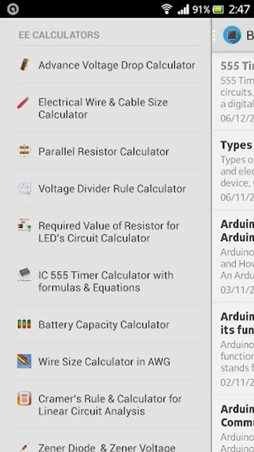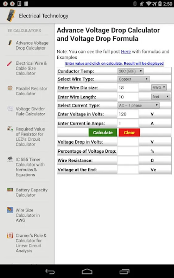 It appears to be downgraded from past history when this app was better. The app is merely an aggregate and employs URL links to a website vs local directories like other apps making it useless. These are glossary 101 terms for components. The calc section is poorly done and crowded to not being able to depict and input correct input parameters due to the radio buttons not aligned to text description for voltages. It also has invasive permissions listed with a wide open network. No Go.