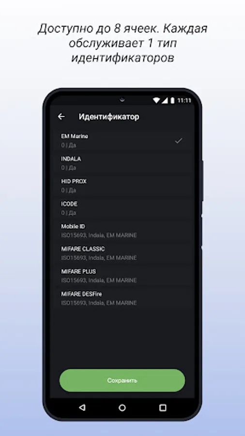- Настройка ячеек программирования. Установка типов идентификаторов, которые будет воспринимать прибор. Настройка шифрования для Mifare и т.п.