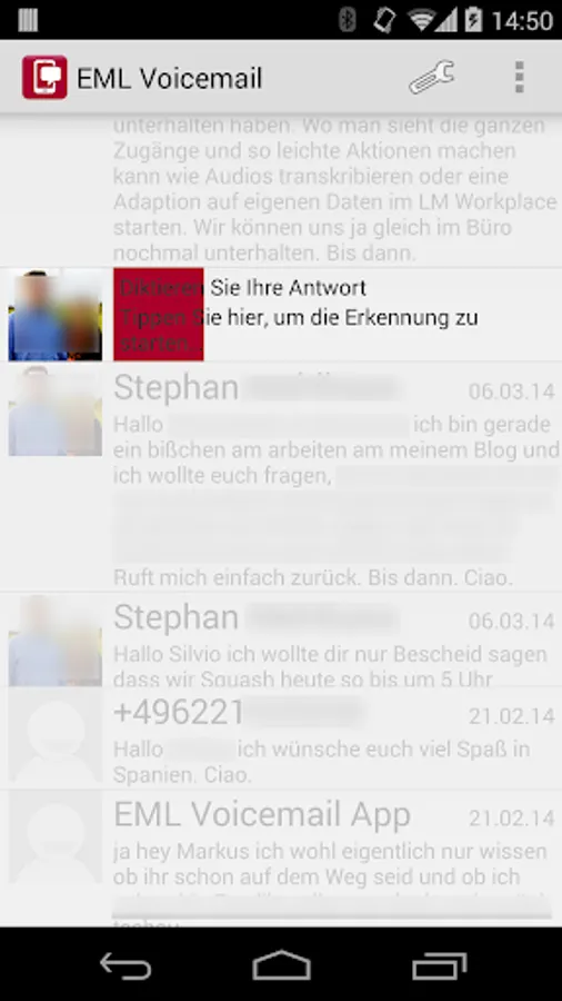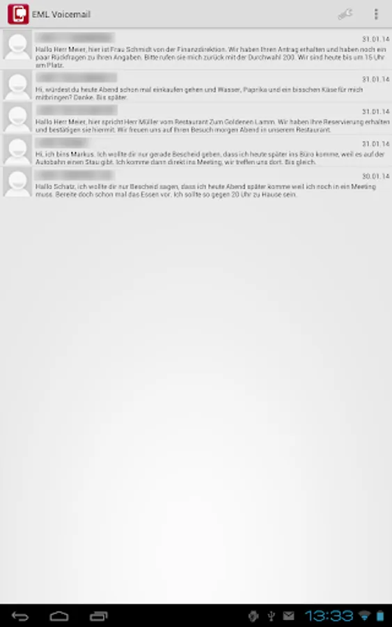 With the EML Voicemail app, you conveniently receive the voicemails from your answering machine at home as text on your Android device, so you can find out what others have to say on the go.