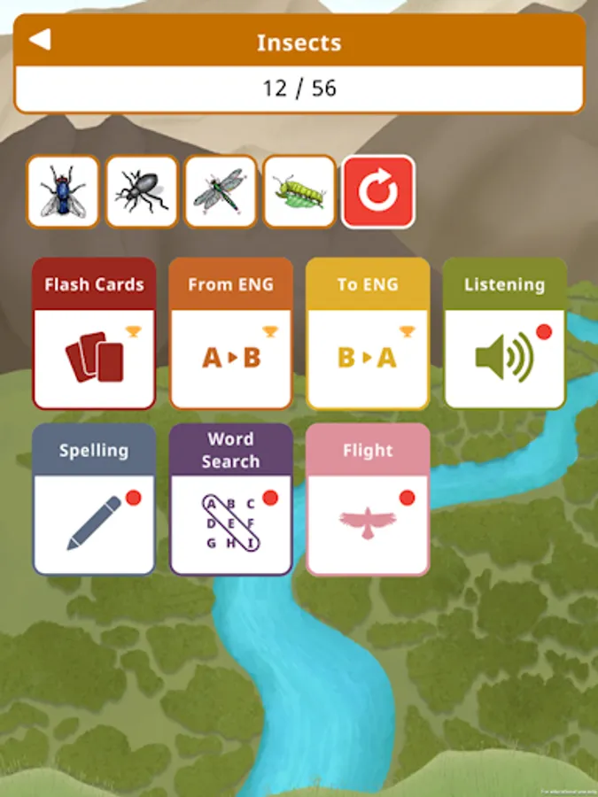 New word-search and flying bird games are great for young learners! Words that are not matched correctly are repeated until you master them. This repetition method is an effective learning strategy.