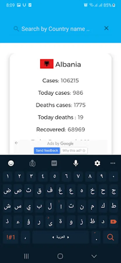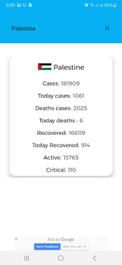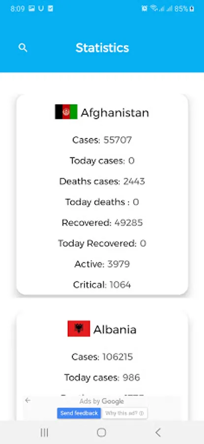 Application provides statistics for all countries on infected, active, critical and recovered cases