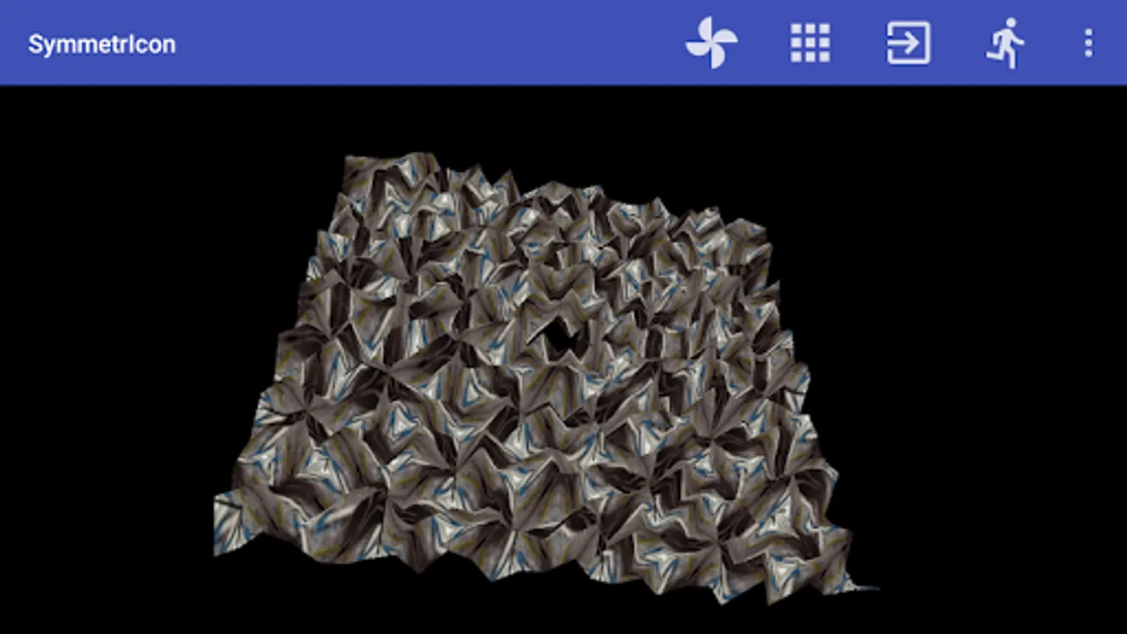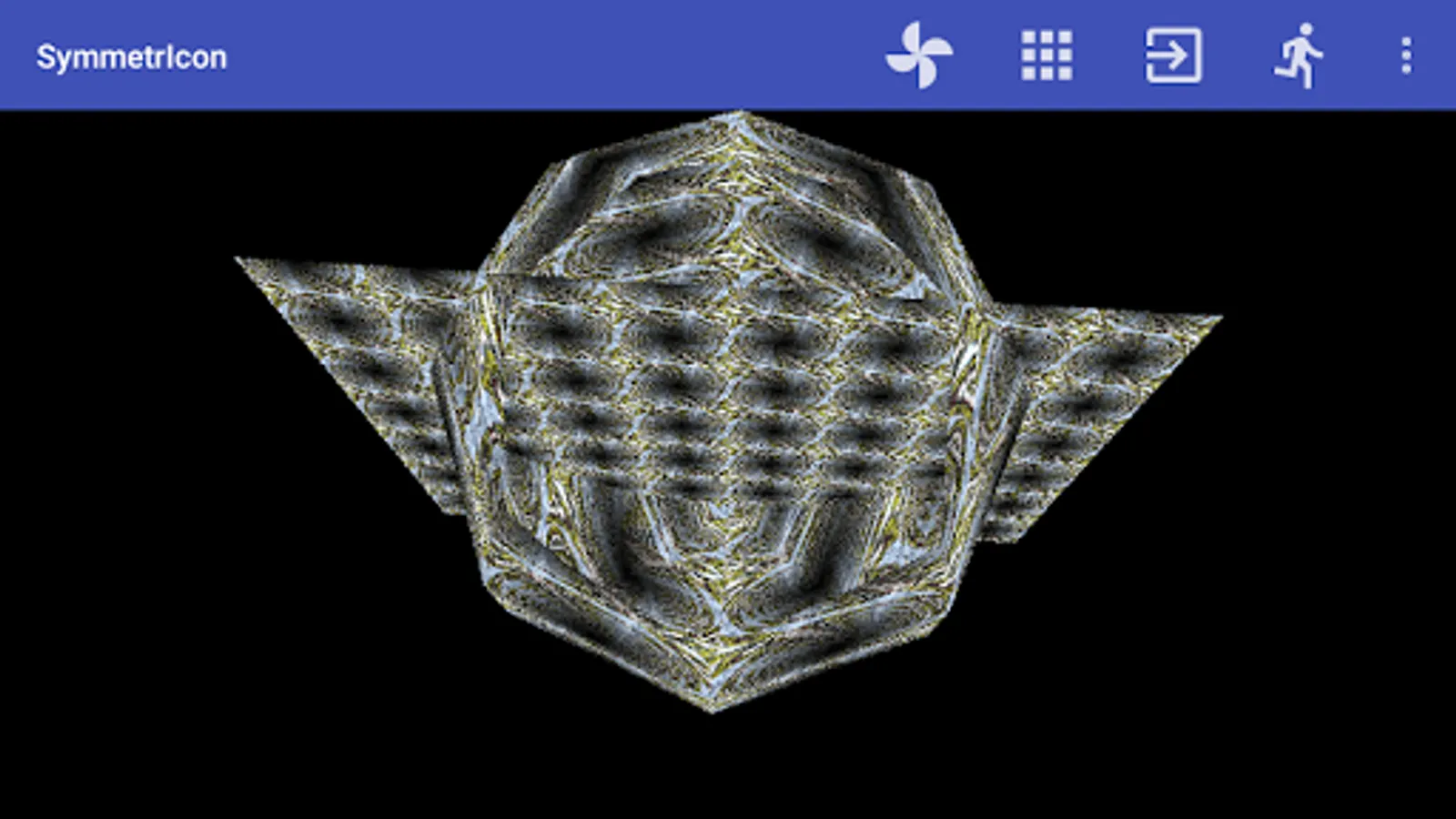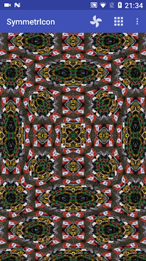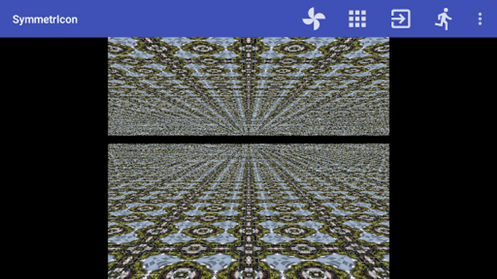 Symmetricon allows the creation of motifs from various media sources. It accepts as input front/back camera stream, images or videos. The user can select any of 30 available symmetry groups and apply them to the current input. Furthermore, he can set the number of motif repetitions. The resulting image/video can then be viewed from different positions/orientations. Resulting images and video frames can be stored as .jpg images.