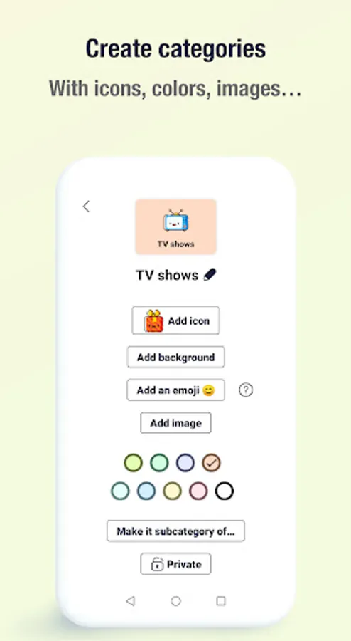 You can customize a variety of settings to suit your taste, e.g. categories background theme, app color…