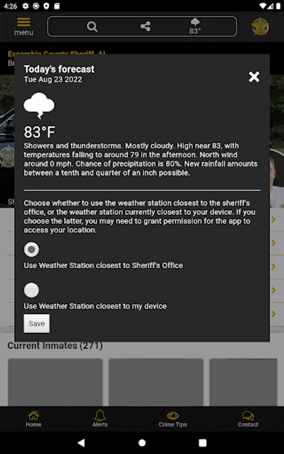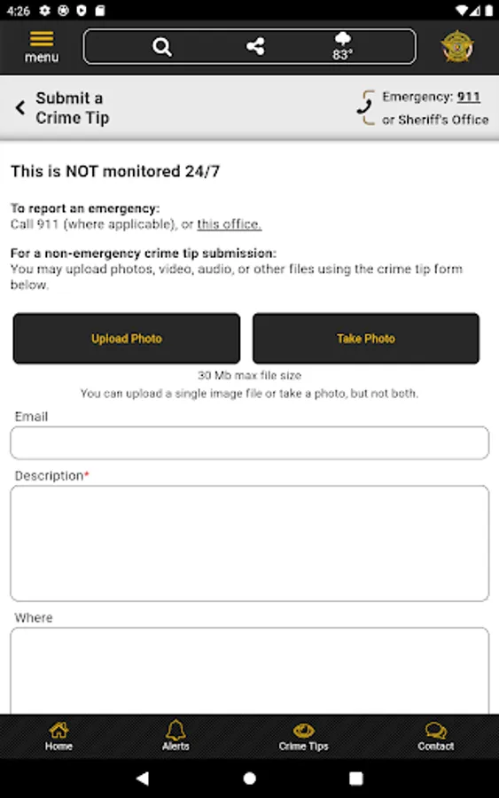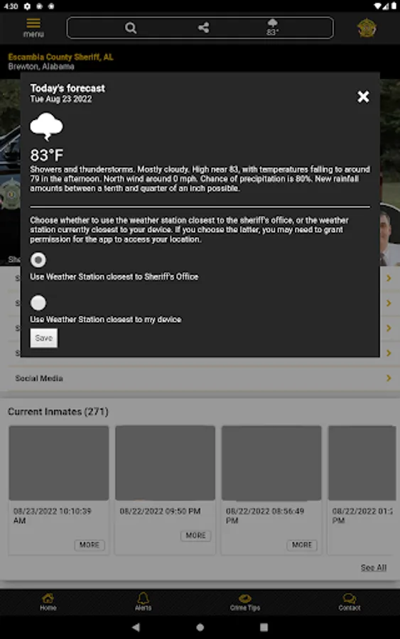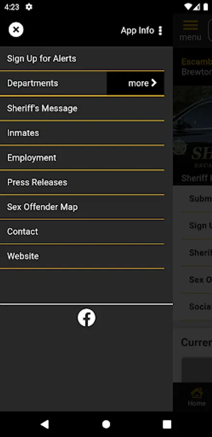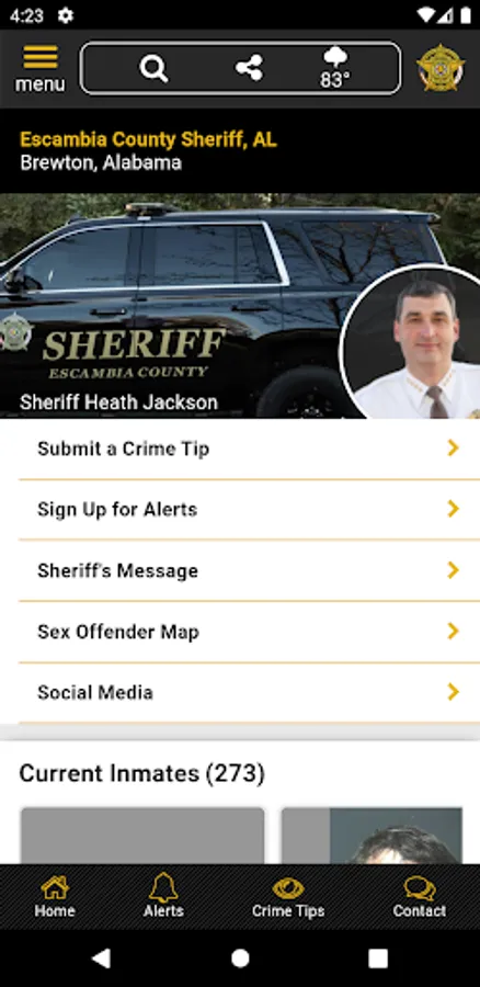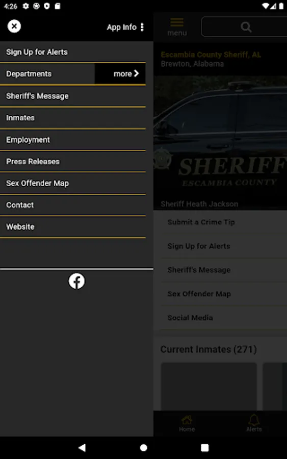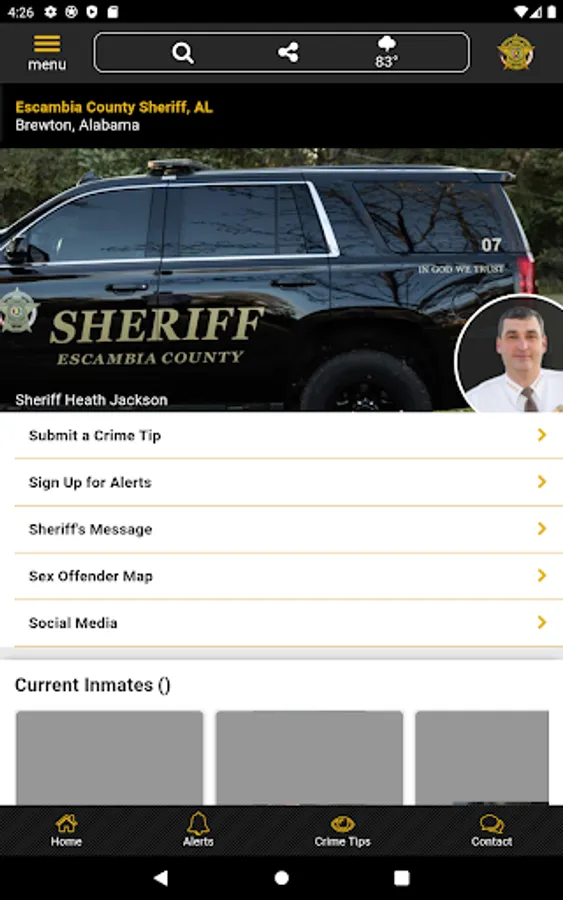 The app has public information for press releases, inmates, most wanted, sex offenders, special alerts, and FAQ's. Crime tips and contact us messages can be sent to the Sheriff's Office.