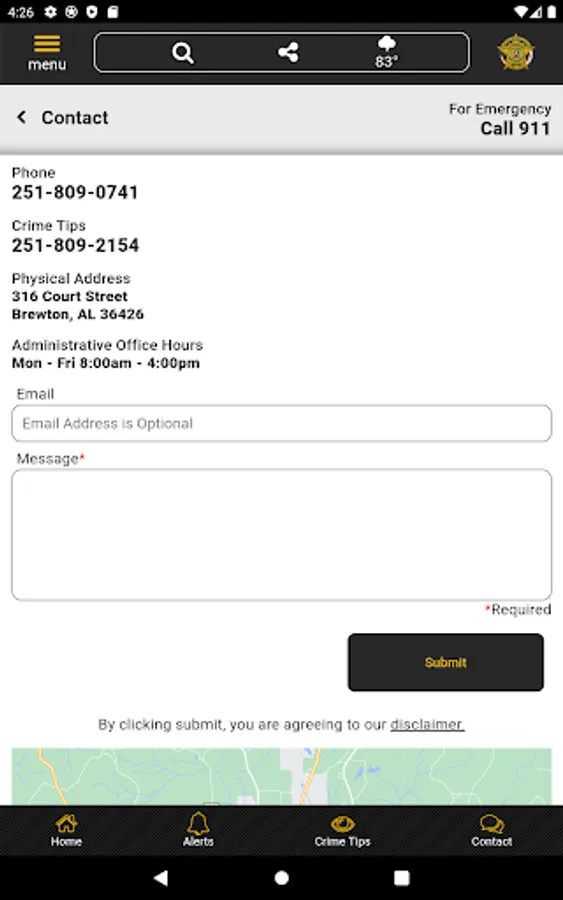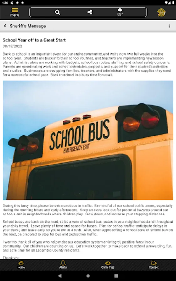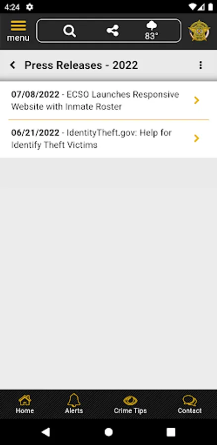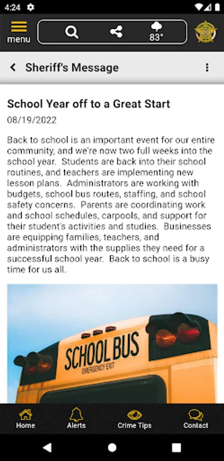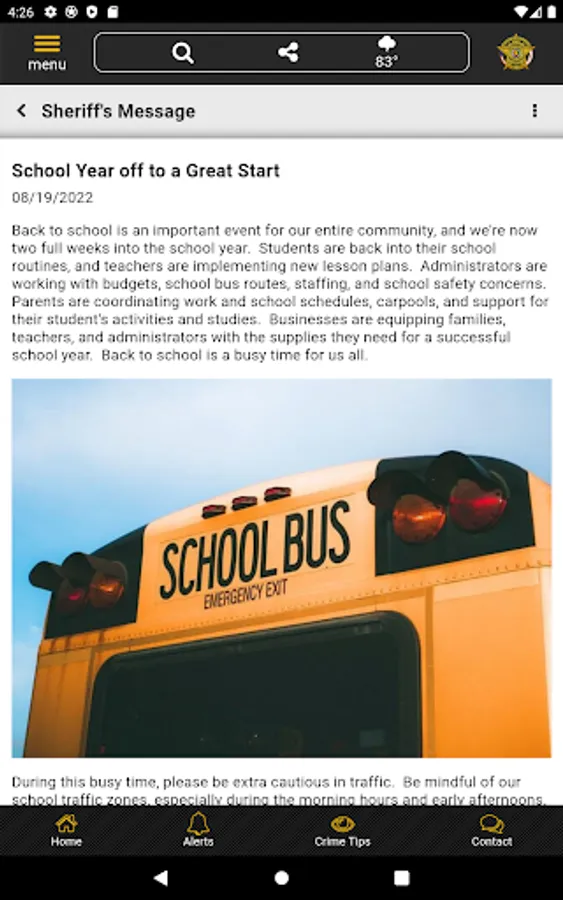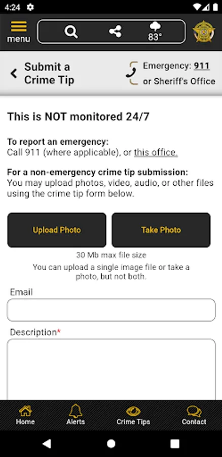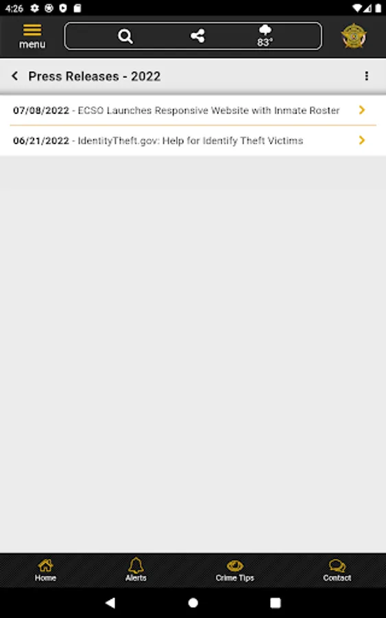 The app has public information for press releases, inmates, most wanted, sex offenders, special alerts, and FAQ's. Crime tips and contact us messages can be sent to the Sheriff's Office.