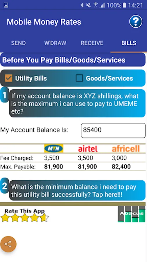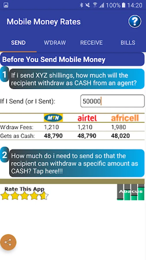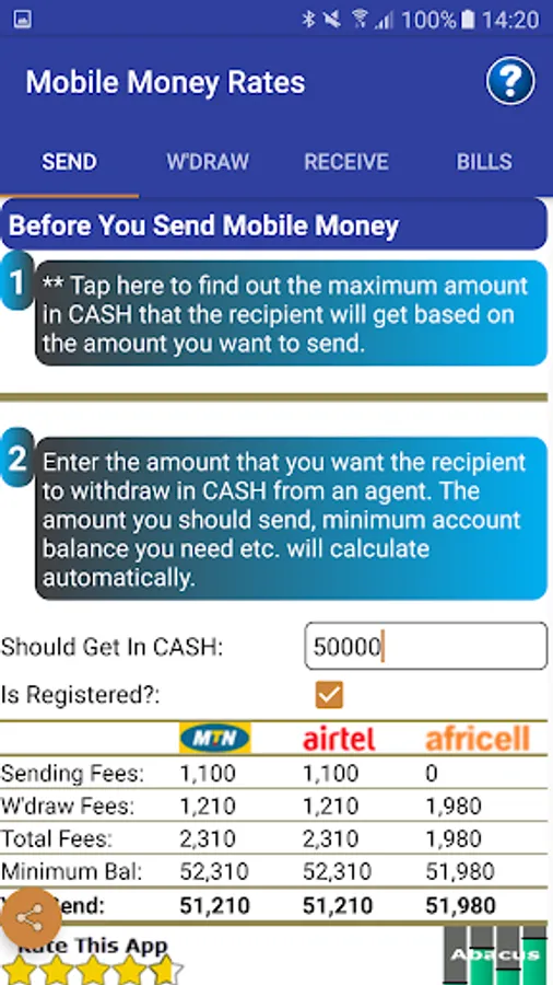 This Mobile Money Rates Calculator will not only save you the hassle of cramming transaction tiers but also save mobile money service providers the cost of designing, printing and distributing the transaction tier charts and posters.