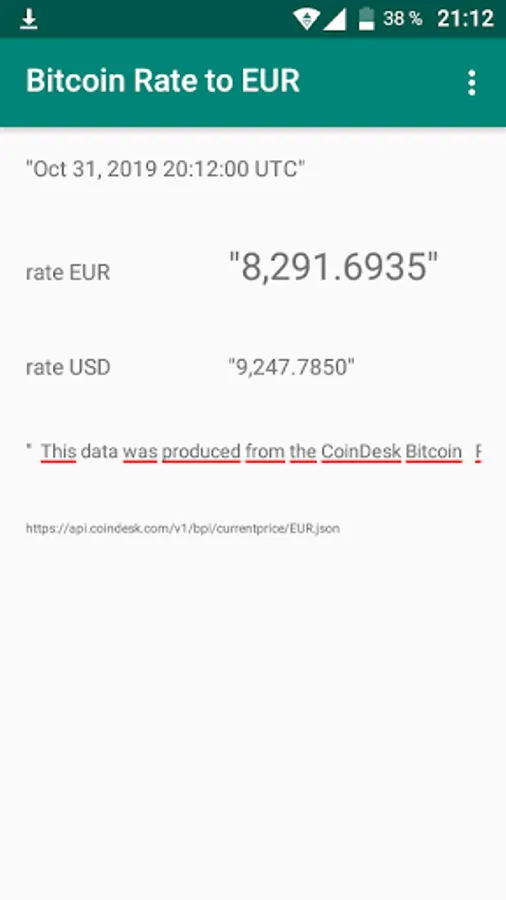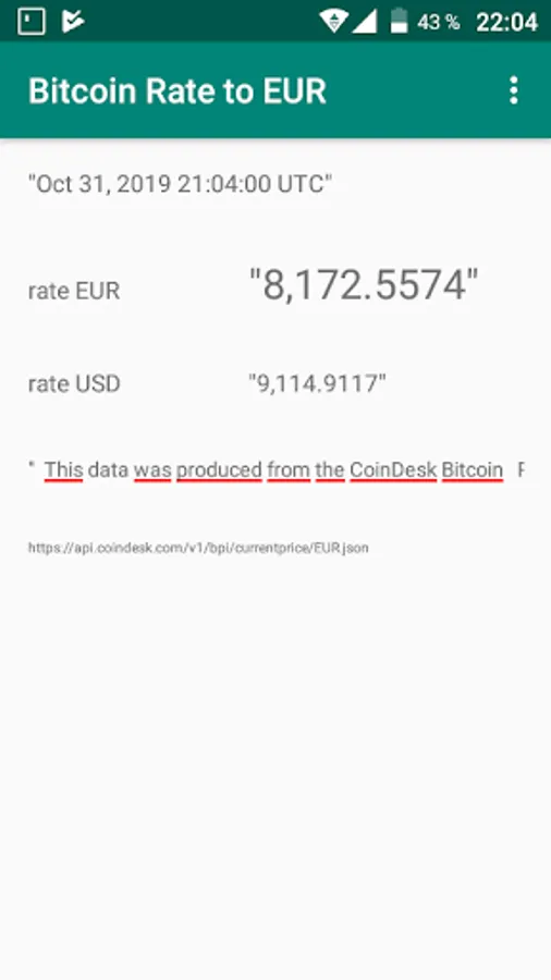This lite app shows cource with less then 1Kbyte traffic waste (Json). The data is received from http://www.coindesk.com/api/.