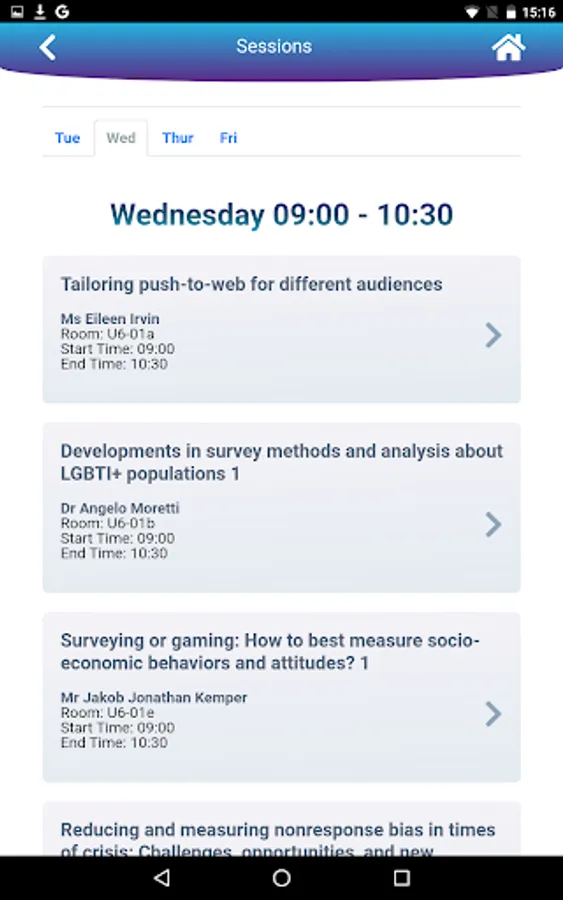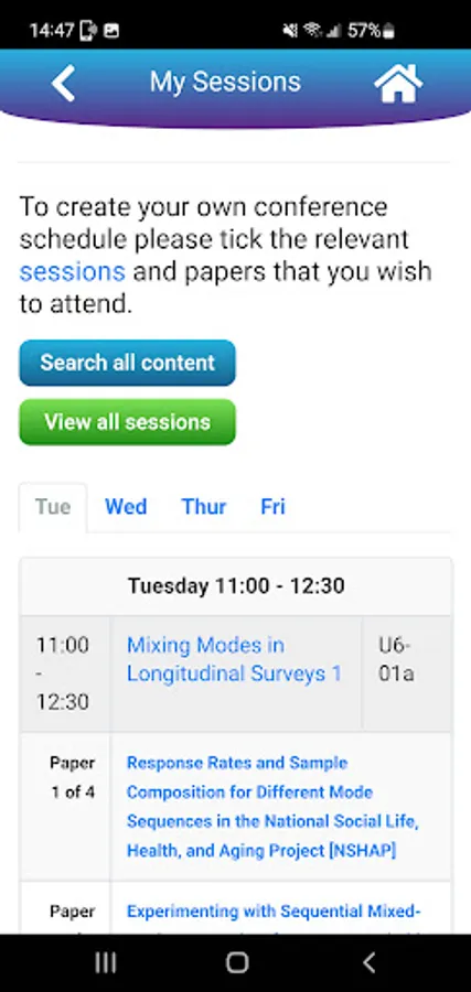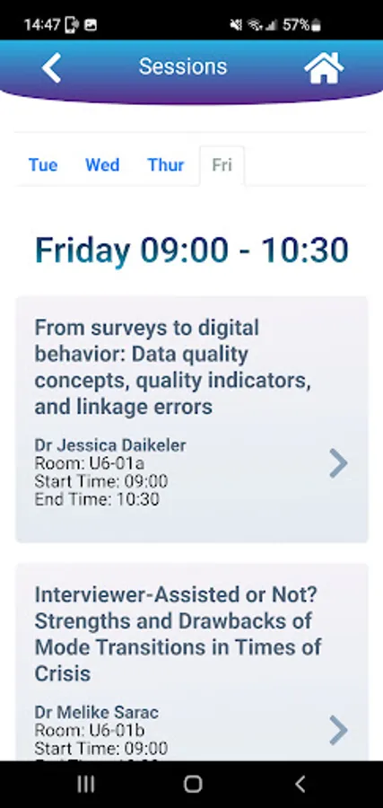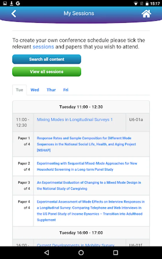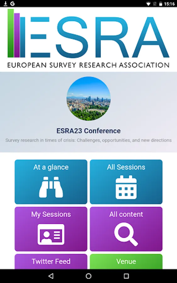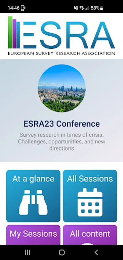 ESRA 2023 is an app for the delegates of the 10th conference of the European Survey Research Association, held in Milan, Italy between 17th and 21th July 2023. The app allows delegates to view and search session information and create personalised timetables.